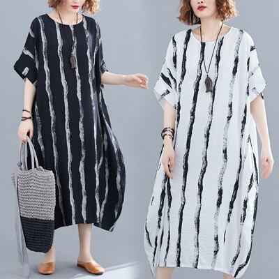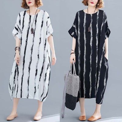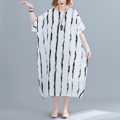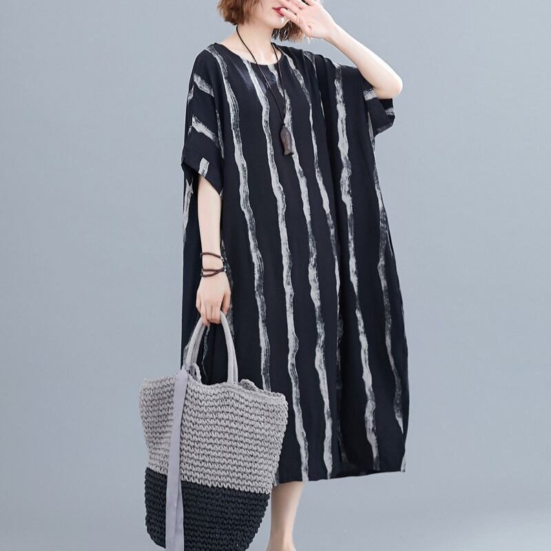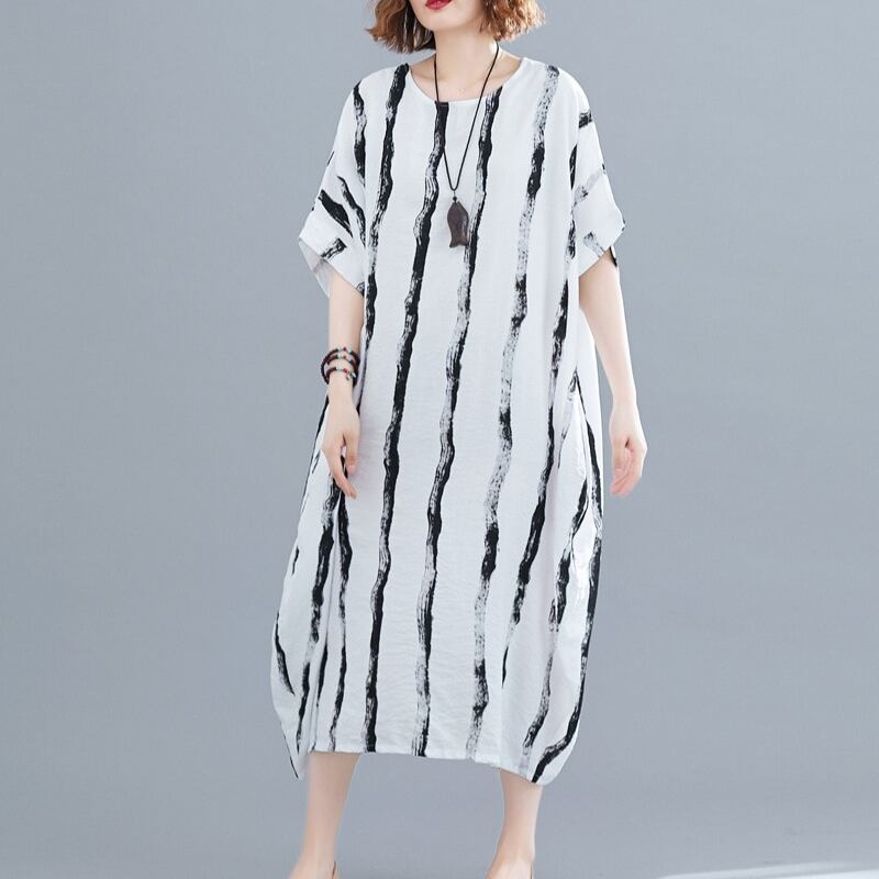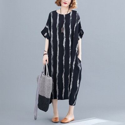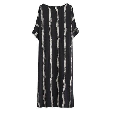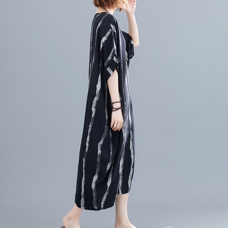 おしゃれで快適なワンピースです。膝下のミディアム丈と半袖デザインが特徴でノーカラー仕様。ゆったりとしたシルエットは体型カバーにも優れ、リラックスした着心地を実現します。