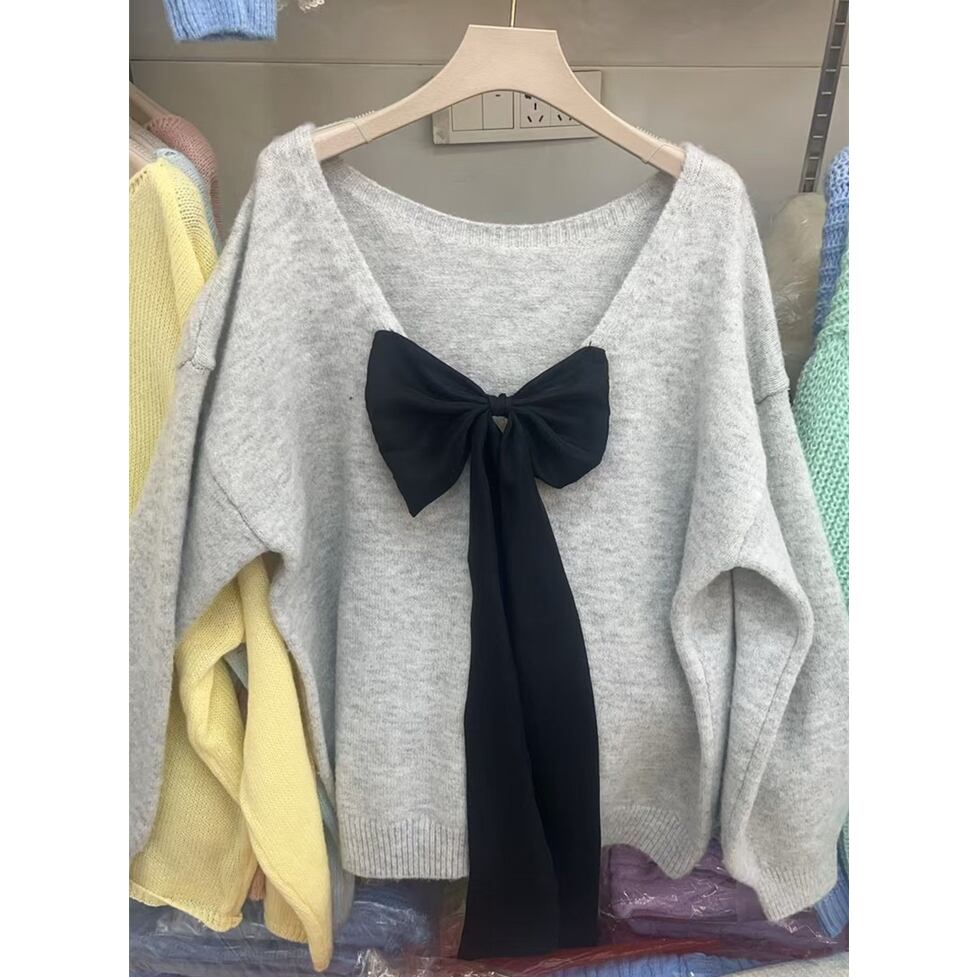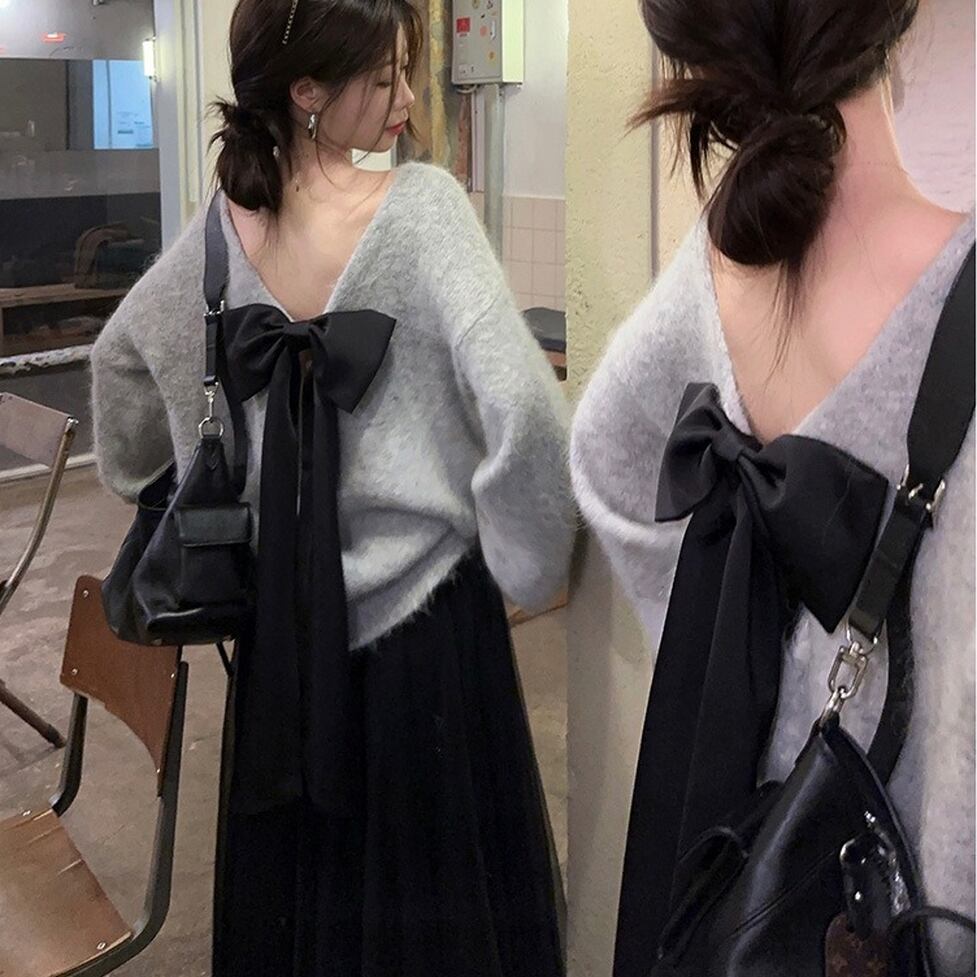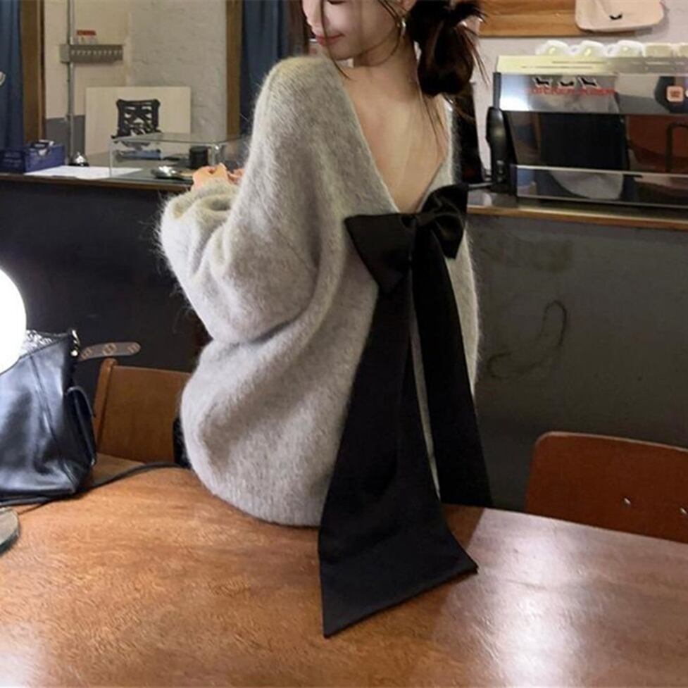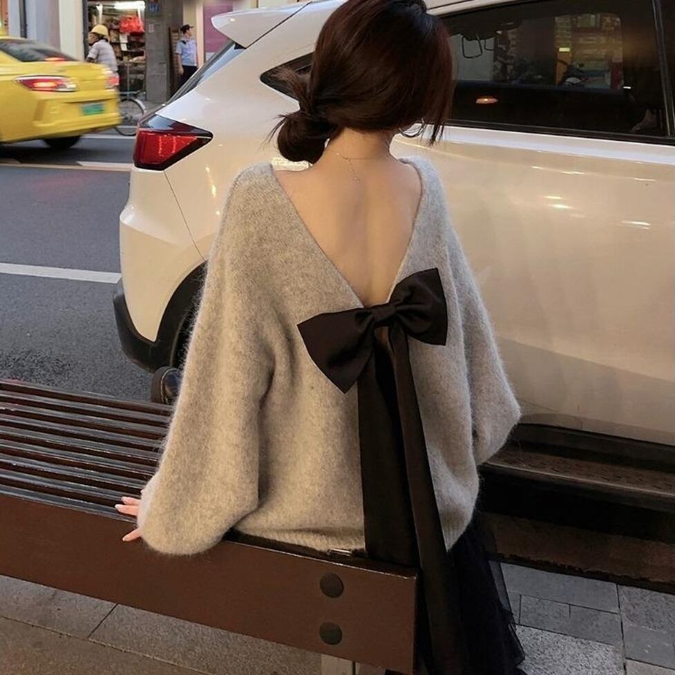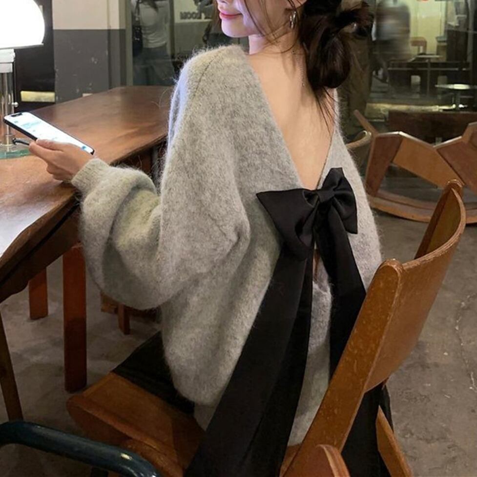 大きなバックリボンで後ろ姿に印象を残すオーバーニット。普遍的な美しさを誇るクラスアップが可能。大人のかわいさが残る知的なイメージを演出。どんな装いも支えてくれる安心感をそなえた圧倒的に使える服