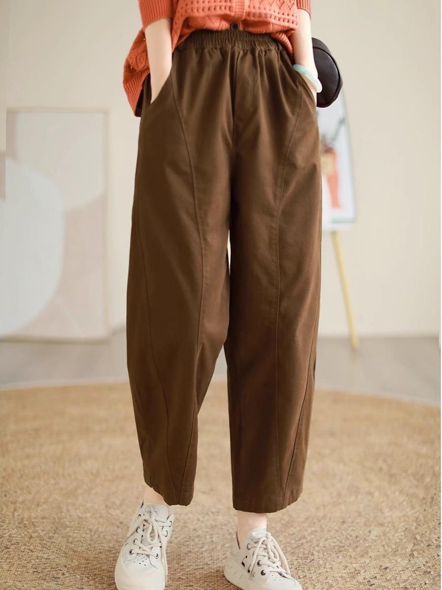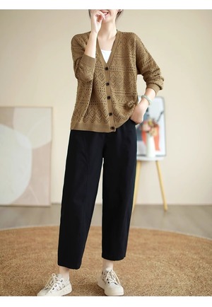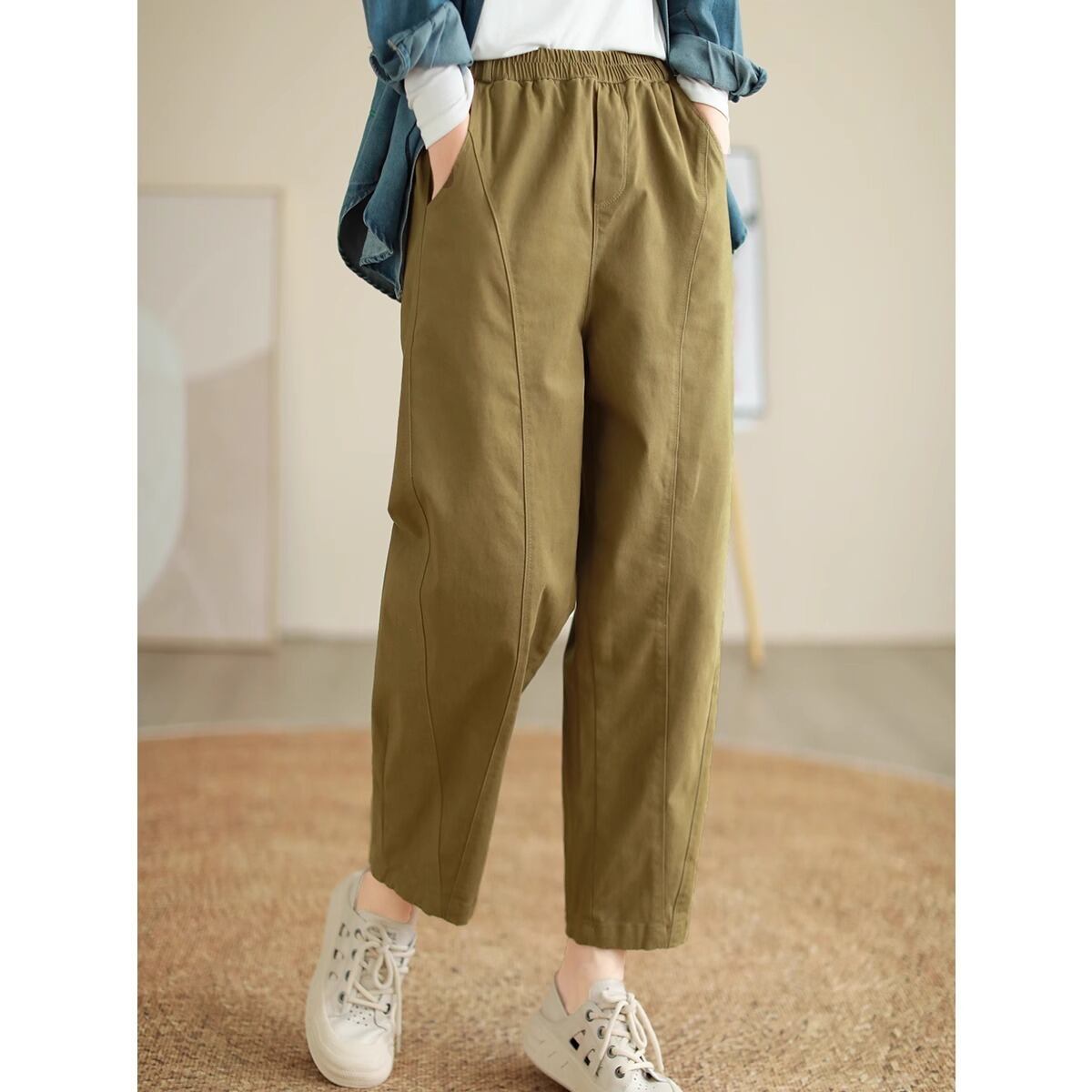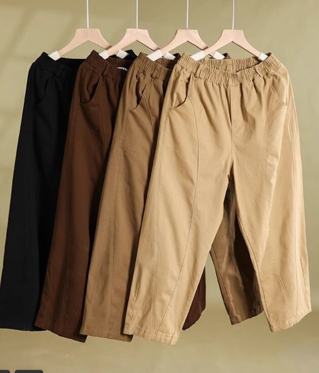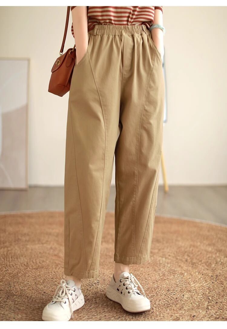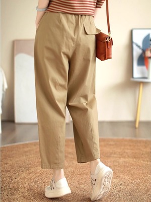 ウエストゴム仕様で楽ちんな着心地ながら、ワイドパンツのデザインが体型をカバーし、ストレートなラインが美脚効果を演出します。