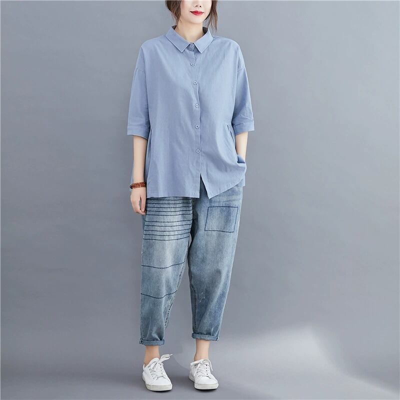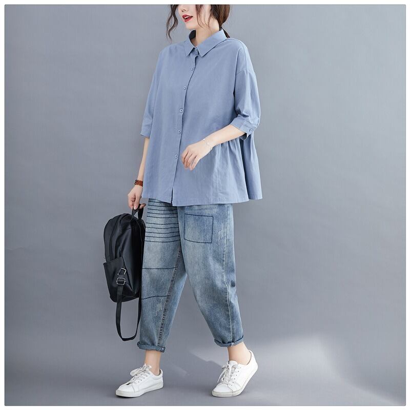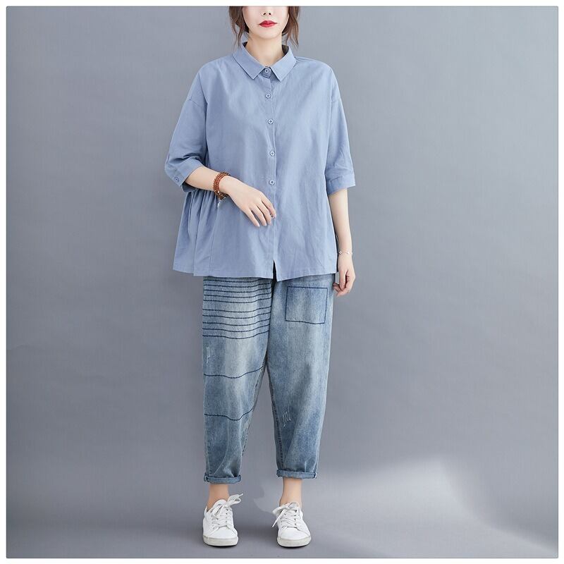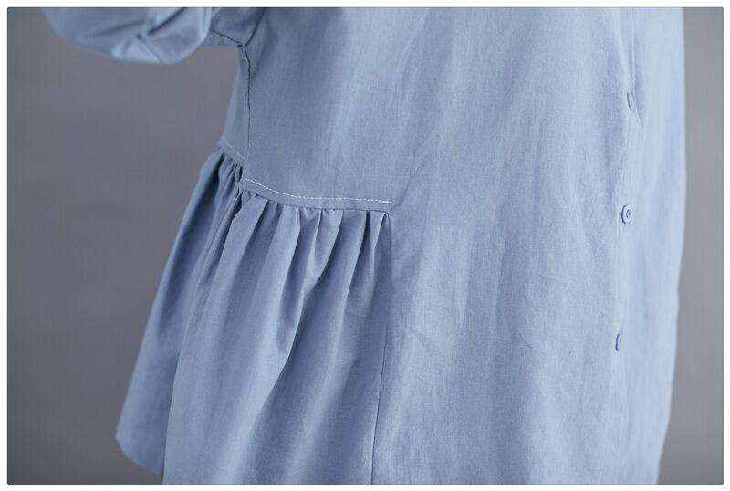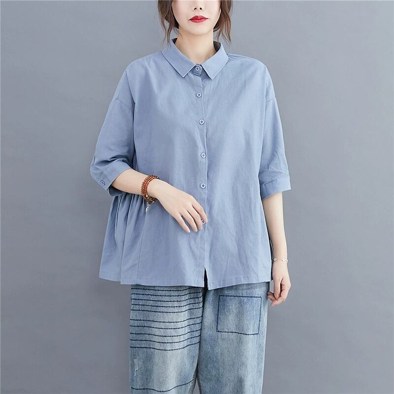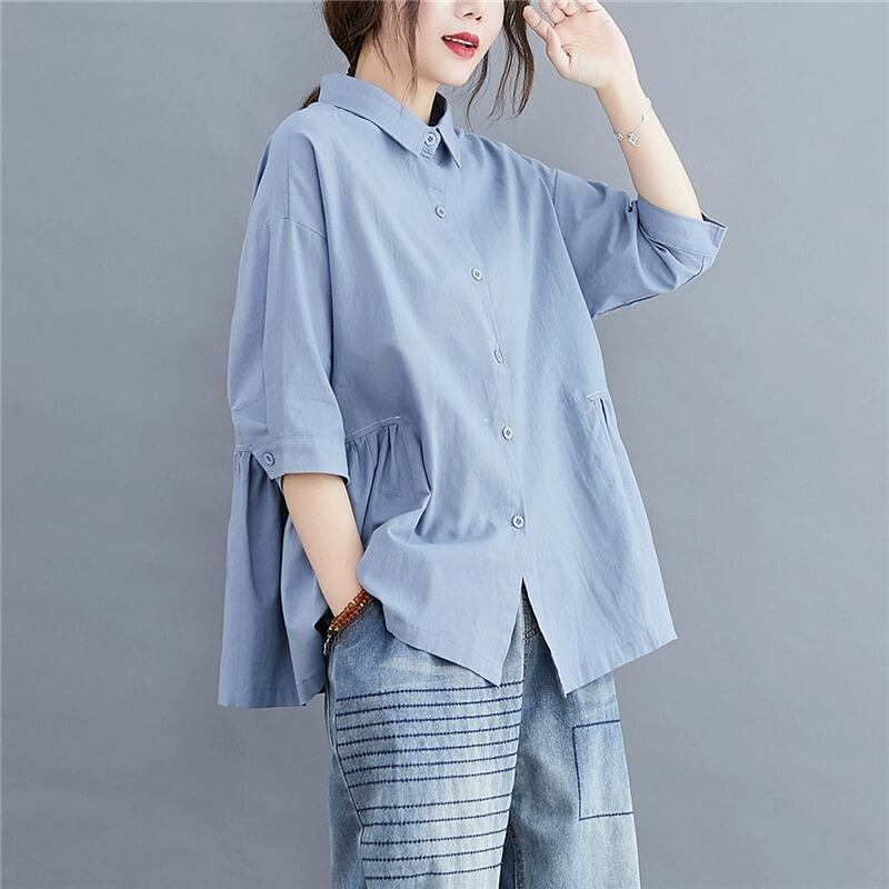 サイドギャザーに前開きデザインのレディースシャツブラウスです。