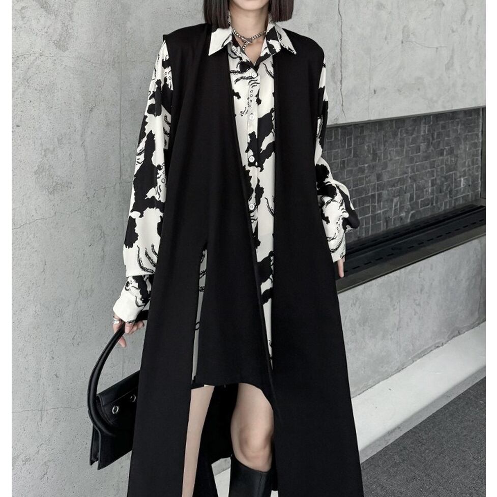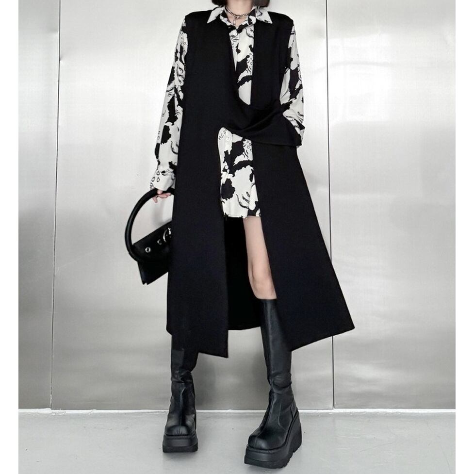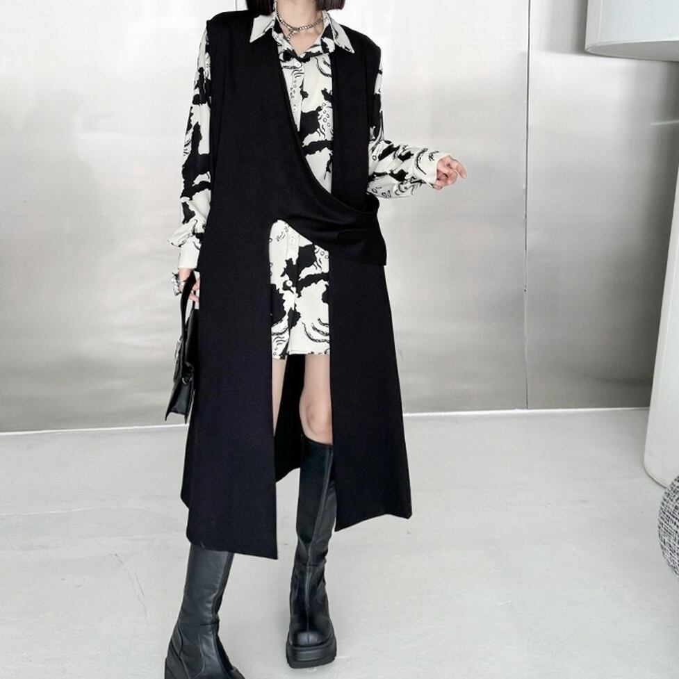 ノーカラーにアシンメトリーなスリットがモードな雰囲気を高めるロングジレ。ハンサムとエレガントの間をとれる優れもの。カジュアルな見た目でもキレイな服にも似合う力量も魅力。親しみやすい特別感に着地。清潔感のあるルックスが出来上がり