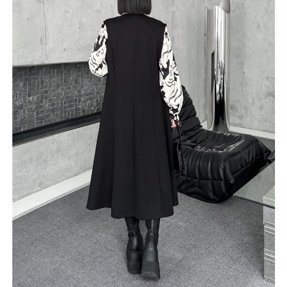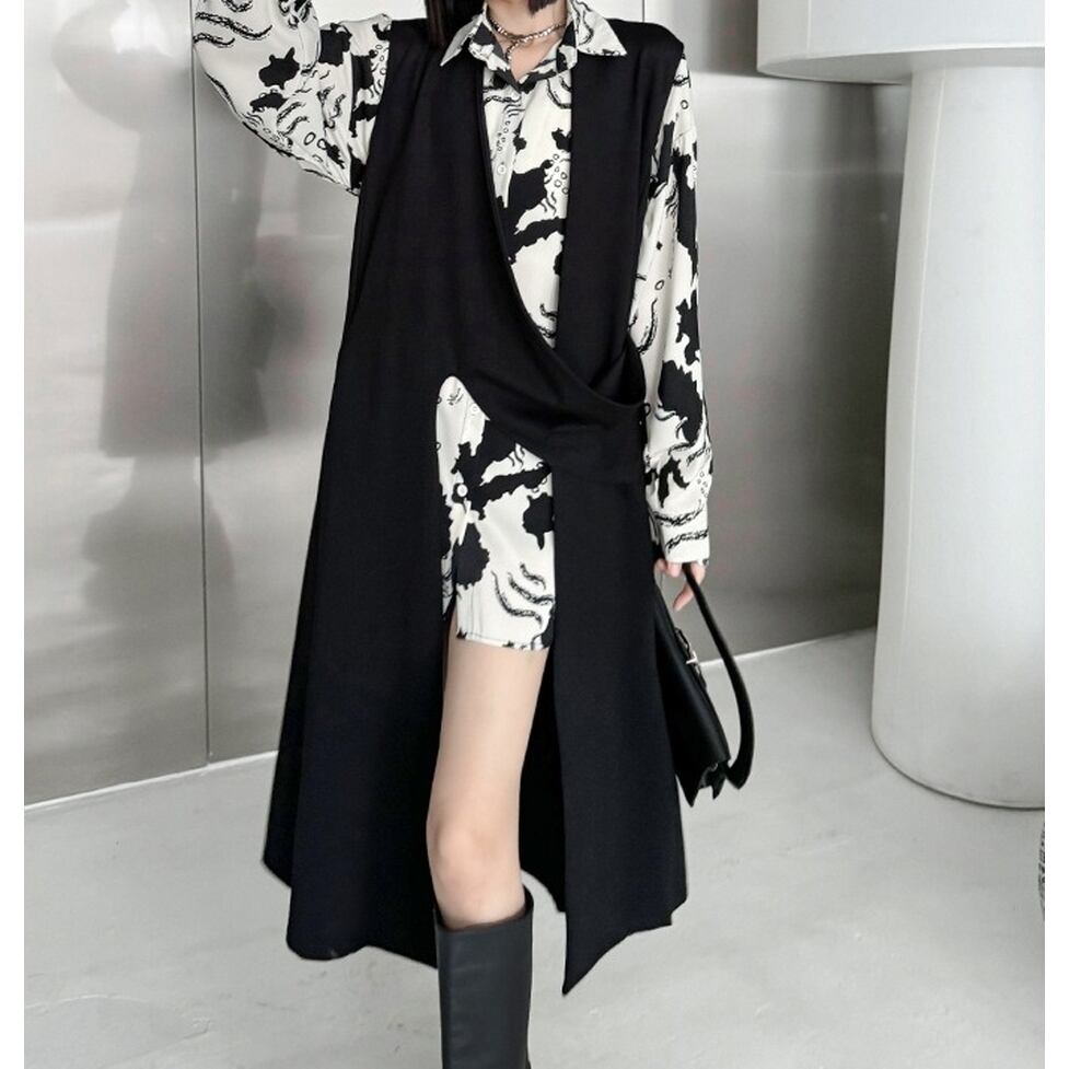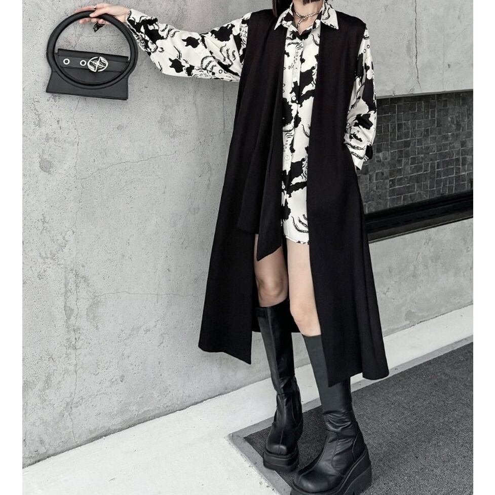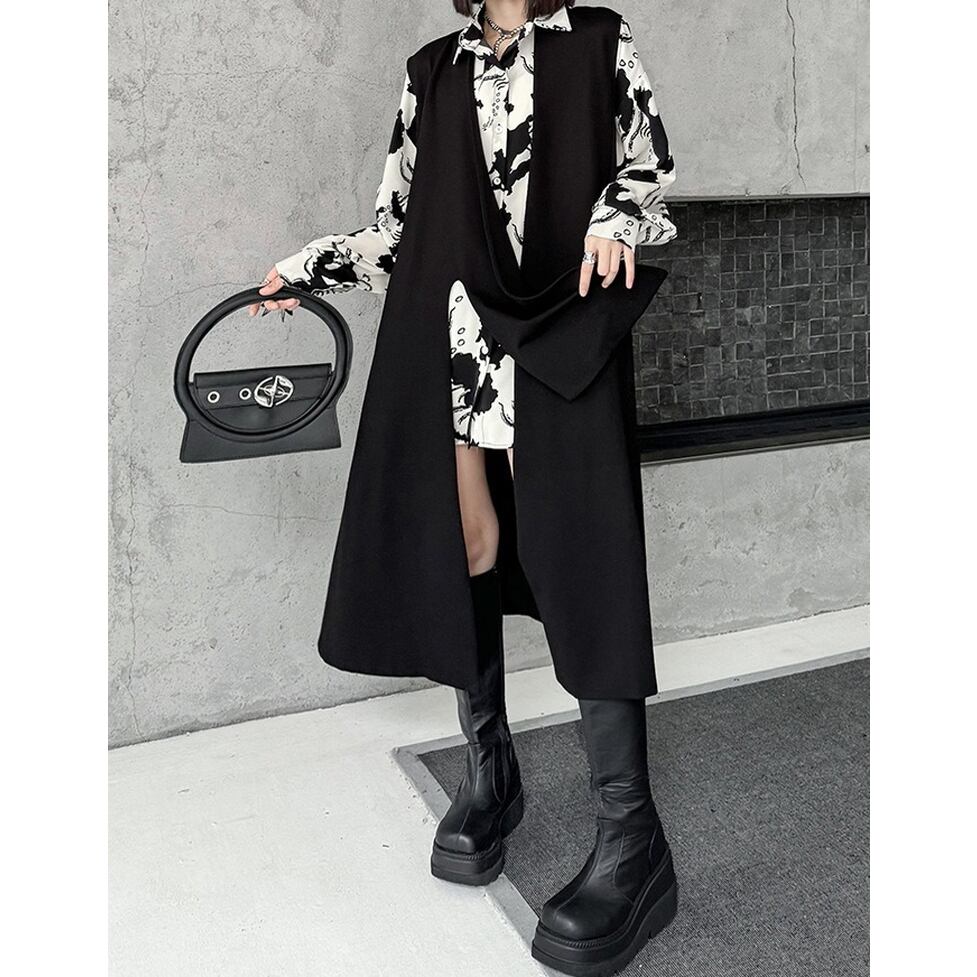 ノーカラーにアシンメトリーなスリットがモードな雰囲気を高めるロングジレ。ハンサムとエレガントの間をとれる優れもの。カジュアルな見た目でもキレイな服にも似合う力量も魅力。親しみやすい特別感に着地。清潔感のあるルックスが出来上がり