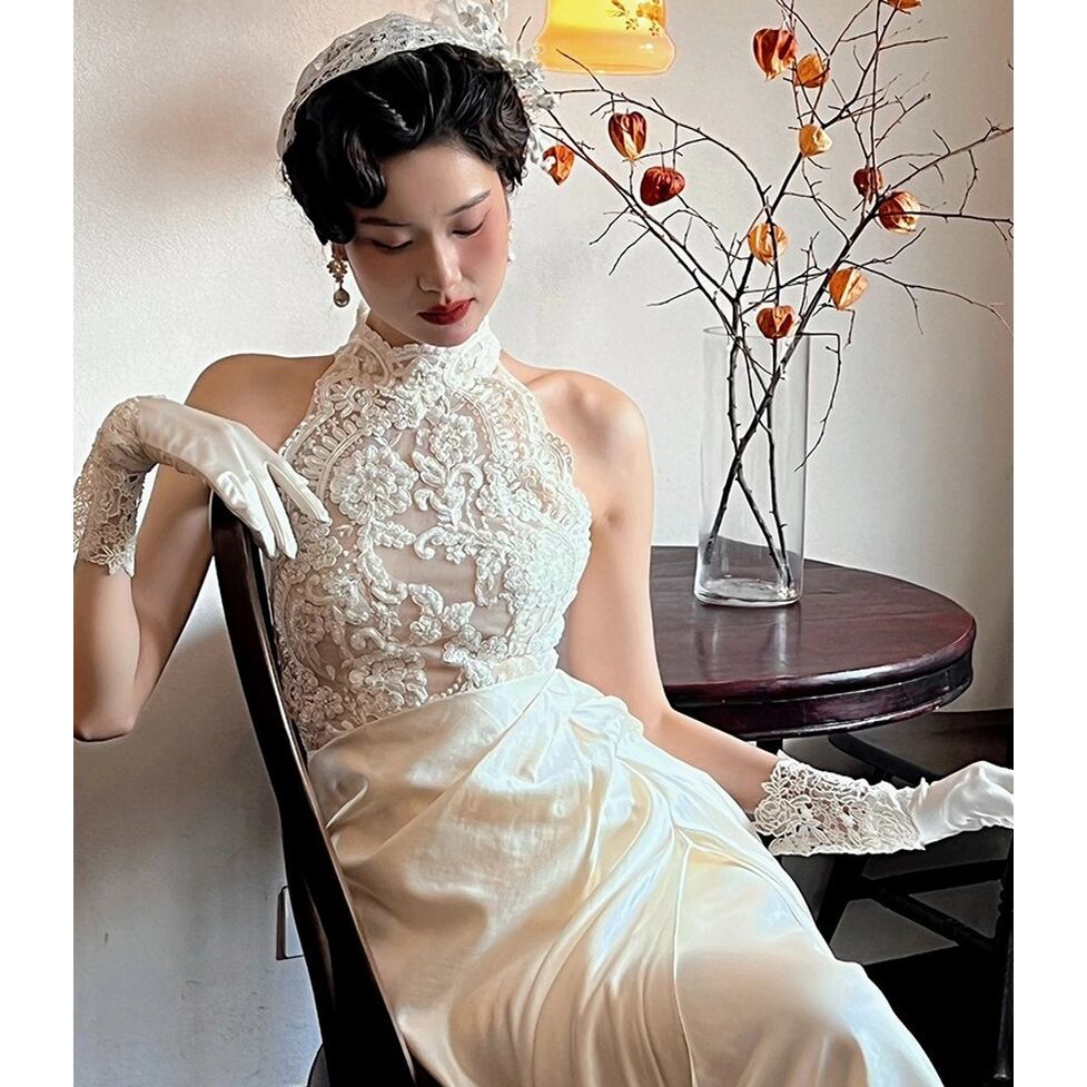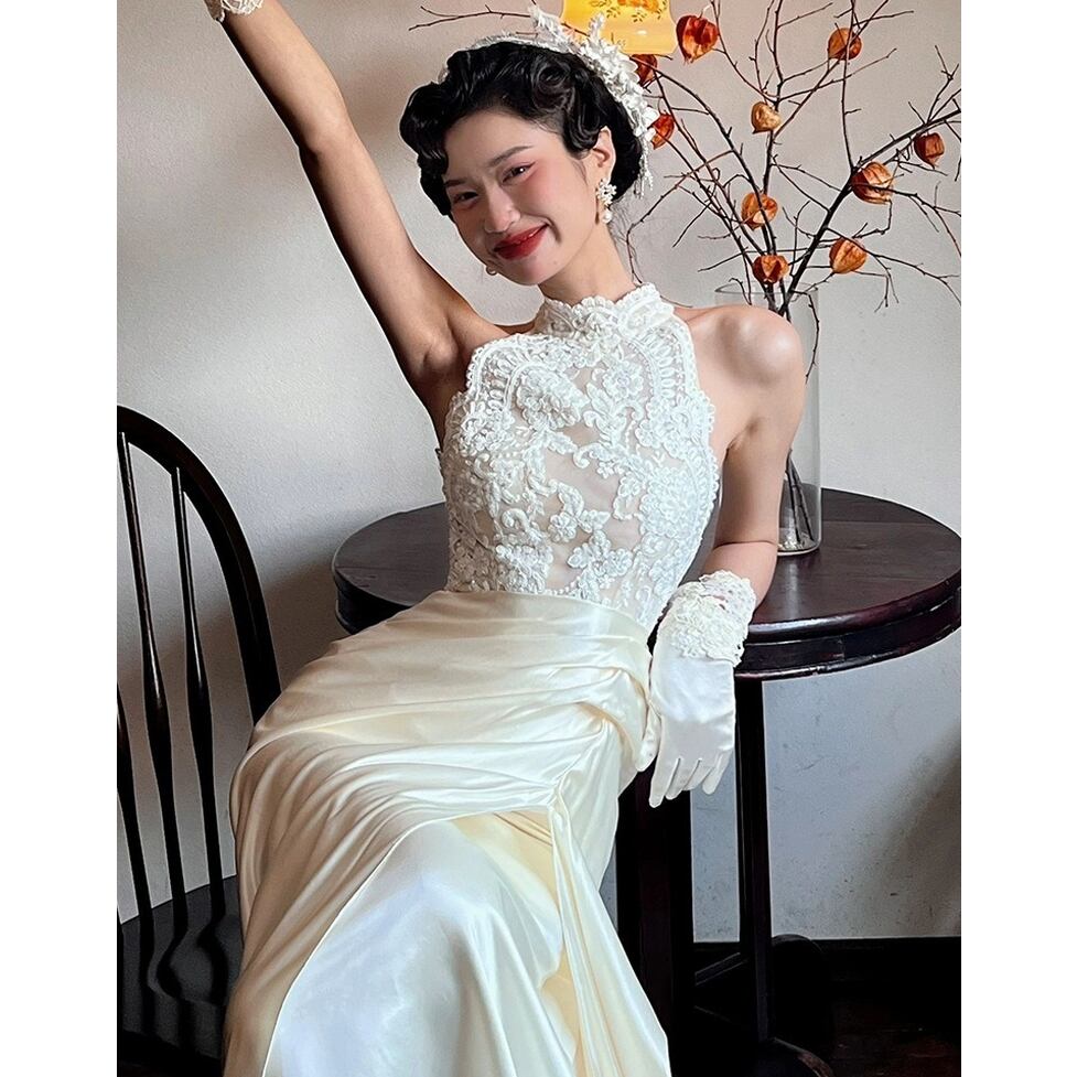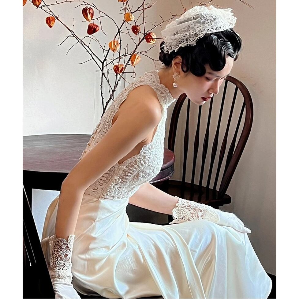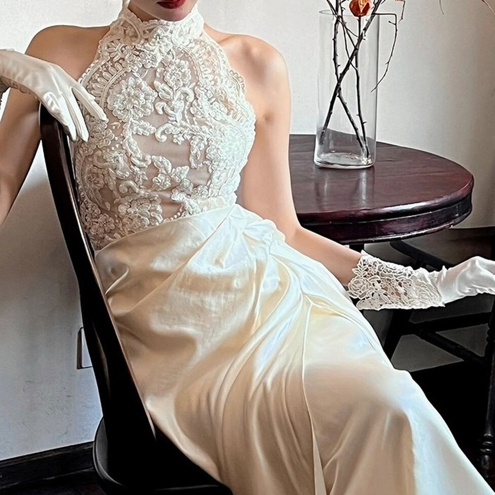透け感のあるレトロなレース使いとギャザーをきかせたスカートが存在感を発揮するロングドレス。動きにともなって美しく映える優美なシルエットを形成。自然と脚が長く見えるスタイルアップも担うデザイン。可憐な甘さを上乗せできる