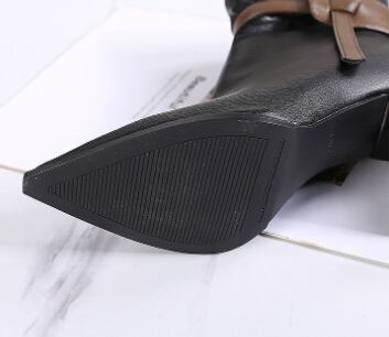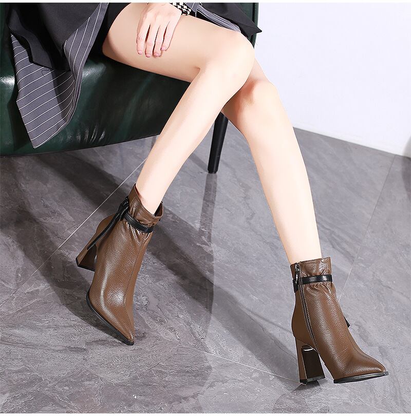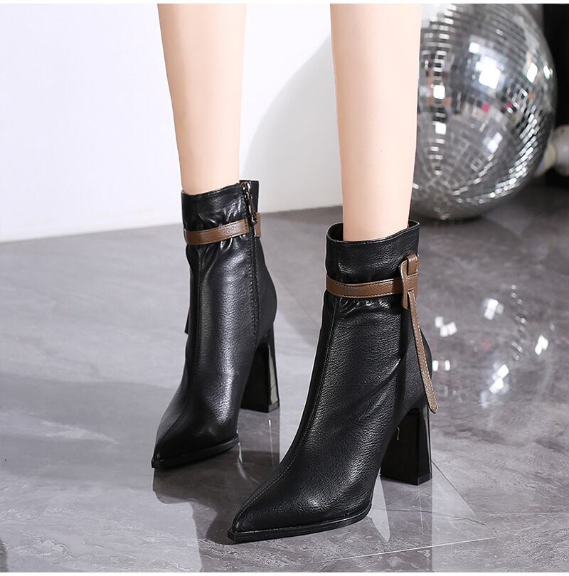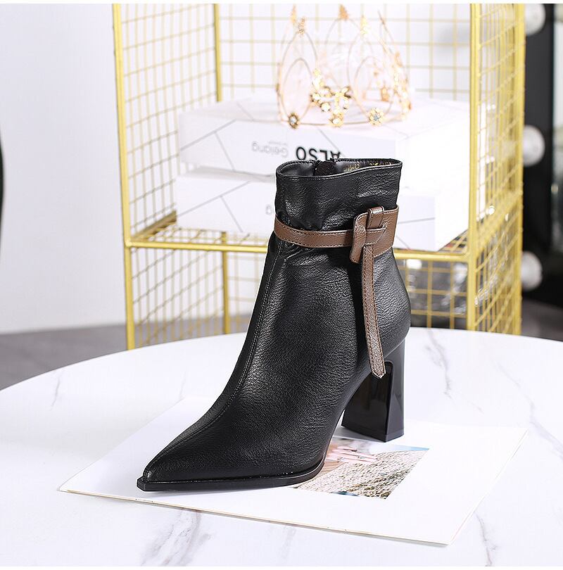 シャープなポインテッドトゥが特徴のレディースブーツ。足首にあしらわれたベルトデザインが上品なアクセントとなり、洗練された大人の雰囲気を演出します。程よい太さのヒールで安定感がありつつ、美脚&脚長効果も叶えてくれる一足です。