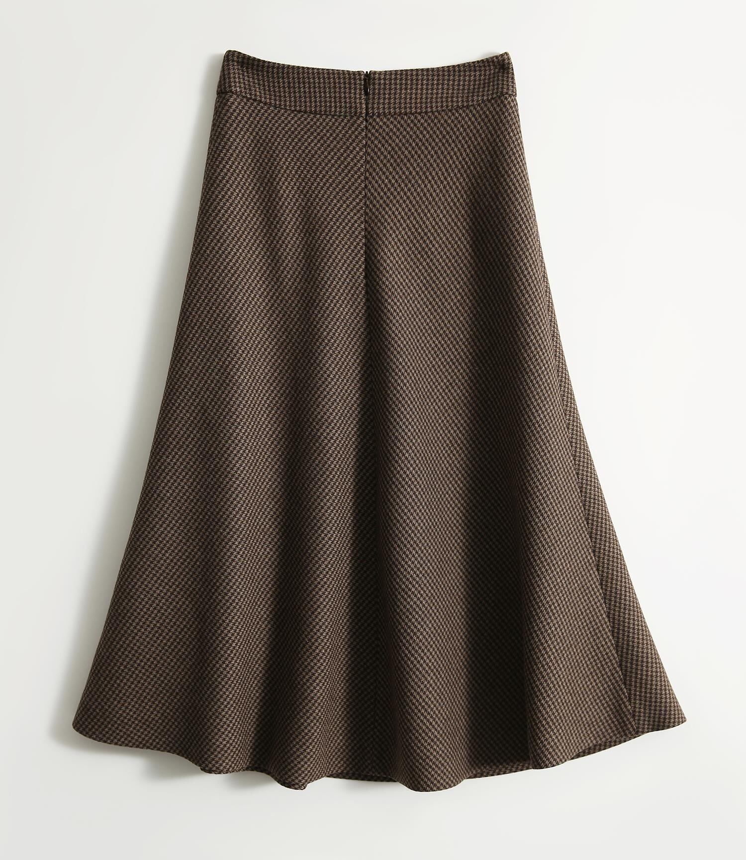 ハイウエストデザインで脚長効果を引き立てつつ、Aラインの広がりが女性らしいフェミニンな印象を演出します。