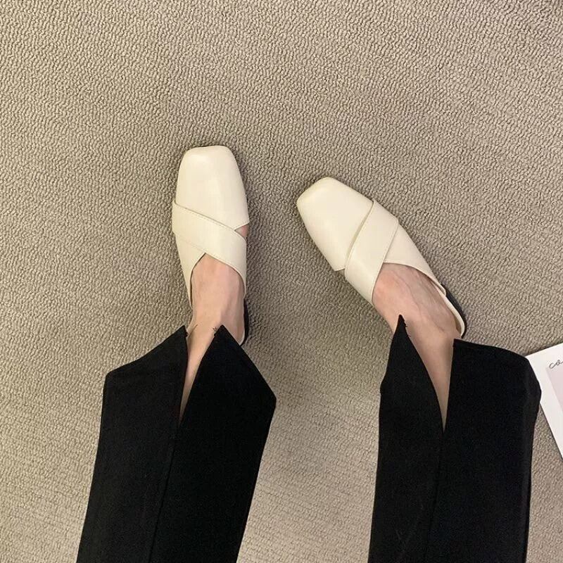 洗練されたスクエアトゥとクロスデザインが特徴のミュールサンダルは、シンプルながらも大人可愛い足元を演出します。