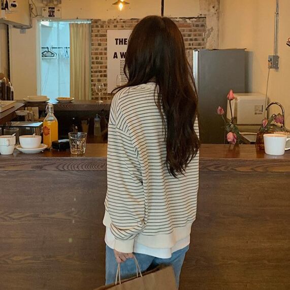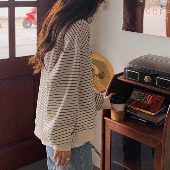 大人可愛いカジュアルスタイルを提案するボーダーカットソーです!ゆったりとしたデザインとボリューム袖が特徴で、リラックスした着心地を実現。ラウンドネックのノーカラー仕様で、洗練された印象を与えつつ、こなれ感を演出します。
