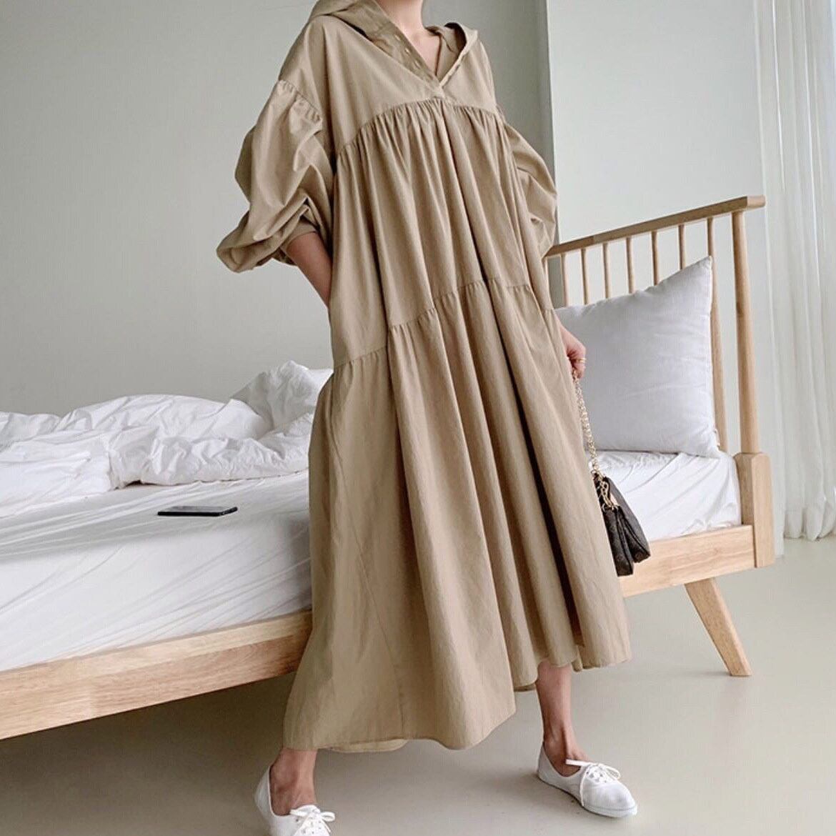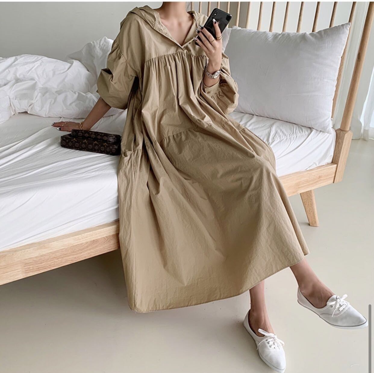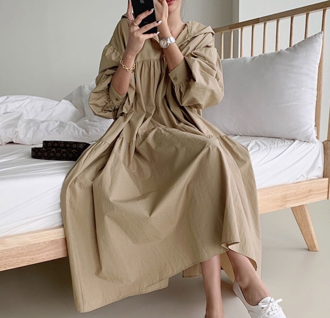 ゆったりとした着心地で動きやすく、春や秋の季節にぴったり。普段使いからおしゃれなカフェスタイルまで、1枚でコーディネートが完成する万能ワンピースです。