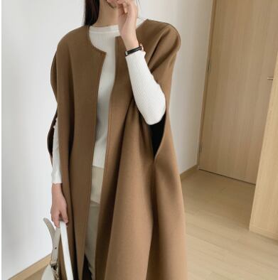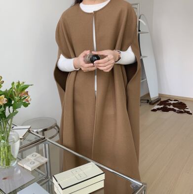モードな雰囲気を纏える、ケープデザインのアウター。肩から流れるようなシルエットが体型を美しくカバーしつつ、洗練された存在感を演出します。ノーカラー仕様で首元をすっきりと見せ、インナーとのレイヤードも楽しめます。