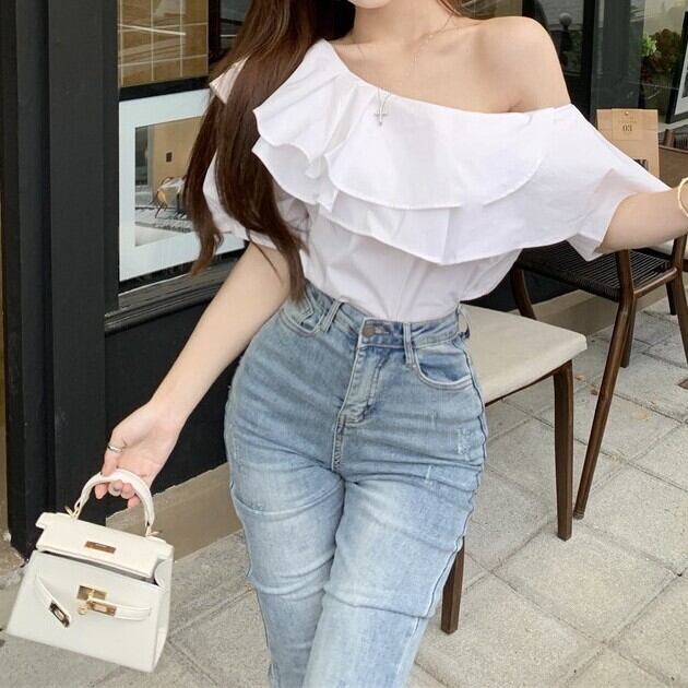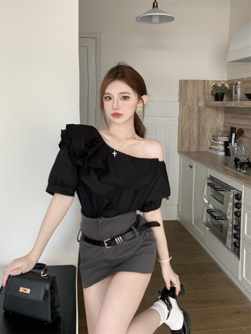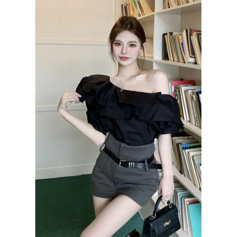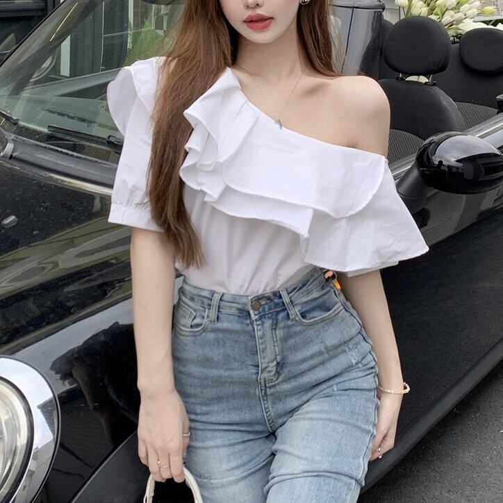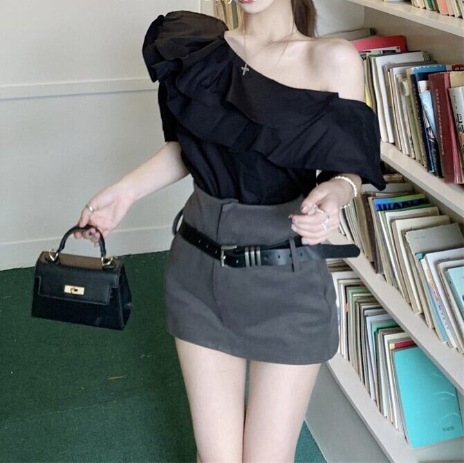 アシンメトリーなデザインが目を引く、ワンショルダーのフェミニンブラウス。軽やかなフリルが女性らしい柔らかさを演出し、1枚で存在感のあるスタイルに仕上がります。5分袖で程よい肌見せが叶い、体型カバーもできるのが嬉しいポイントです。