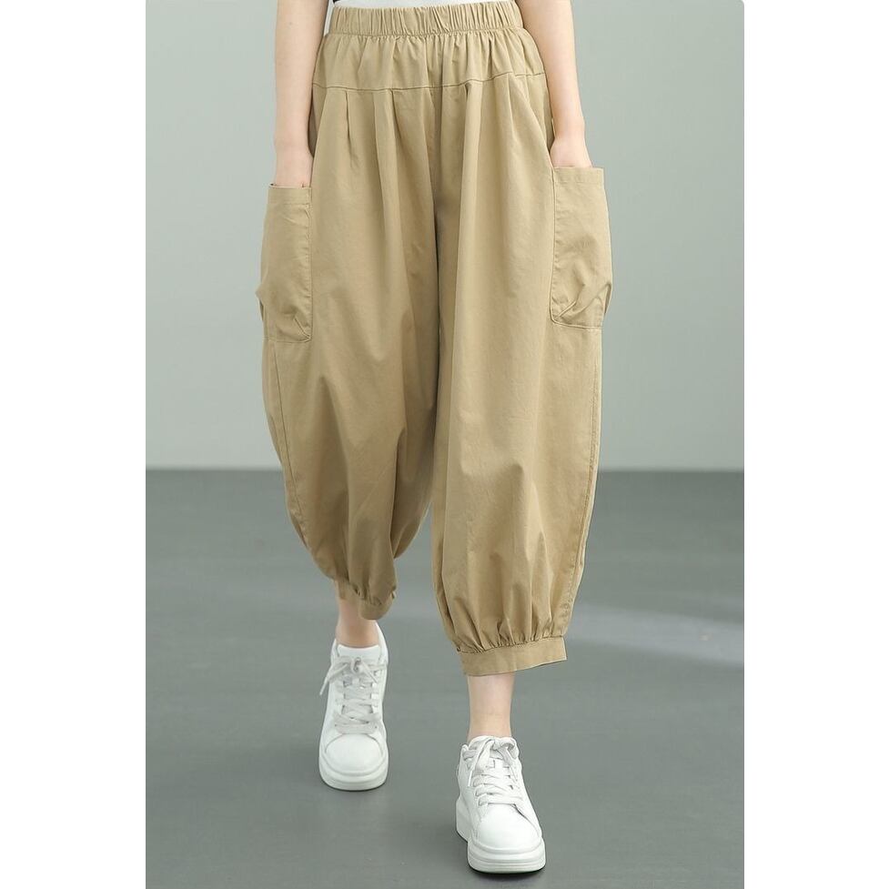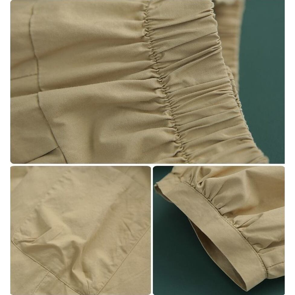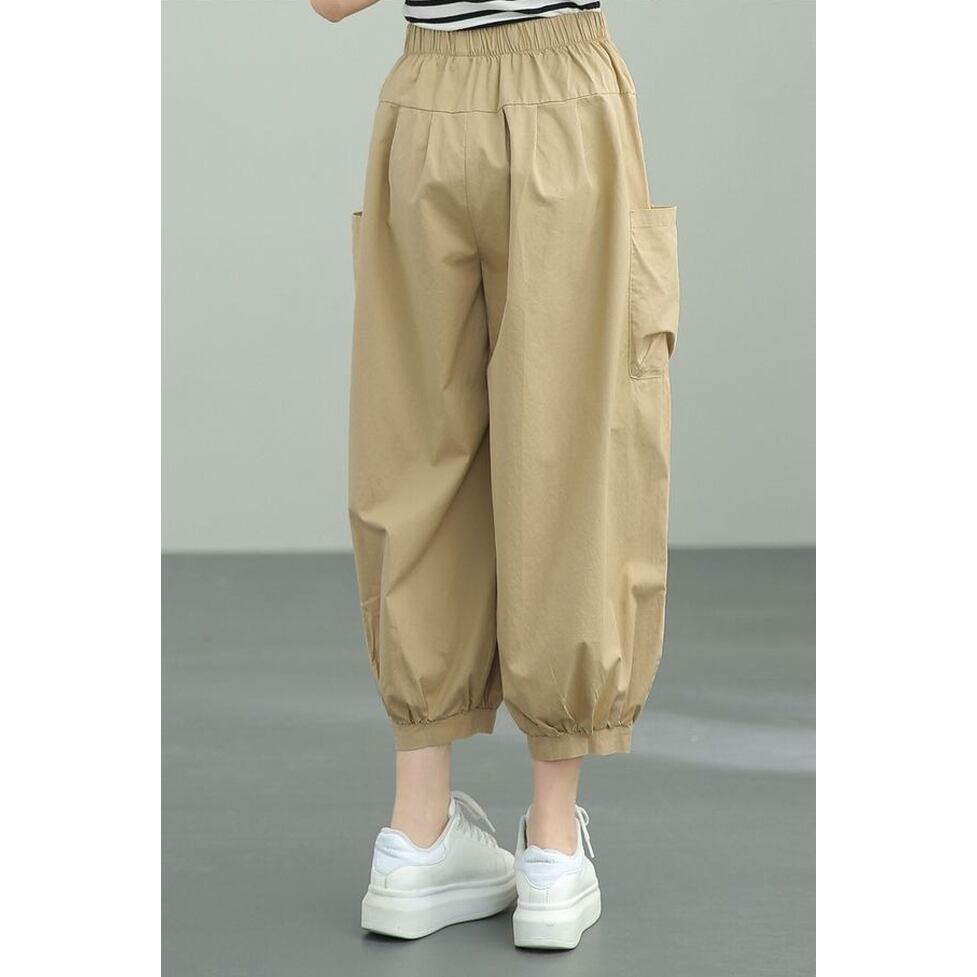 適度な太さでウエストもすそもしぼれるワークパンツ。コンパクトなトップスとバランスがとれ重心も上がって見える実は女性らしさが際立つ服。ご近所に行くぐらいの気楽な装いでもさまになる