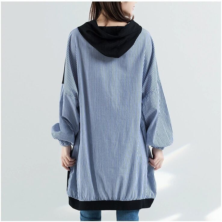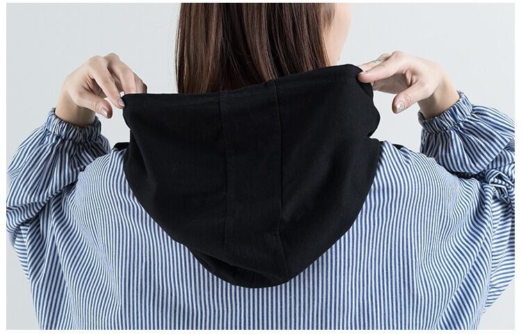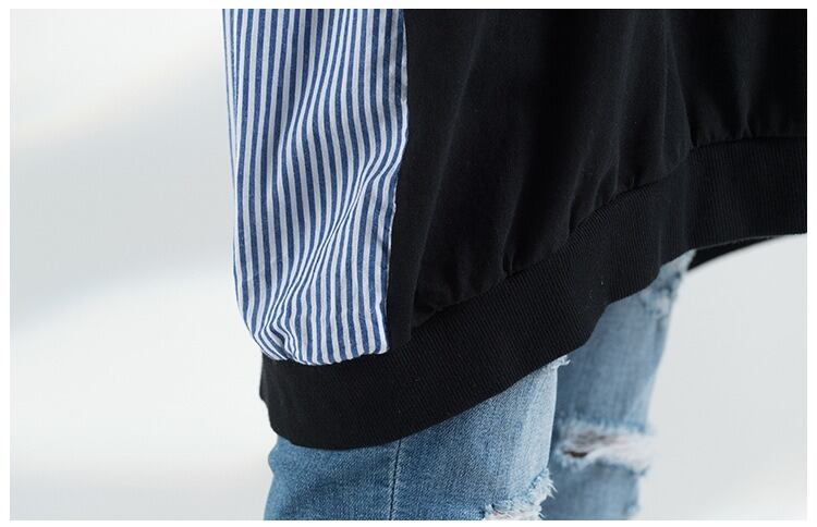 無地のブラックにストライプ柄を合わせることで、一枚で存在感のあるスタイルを演出します。