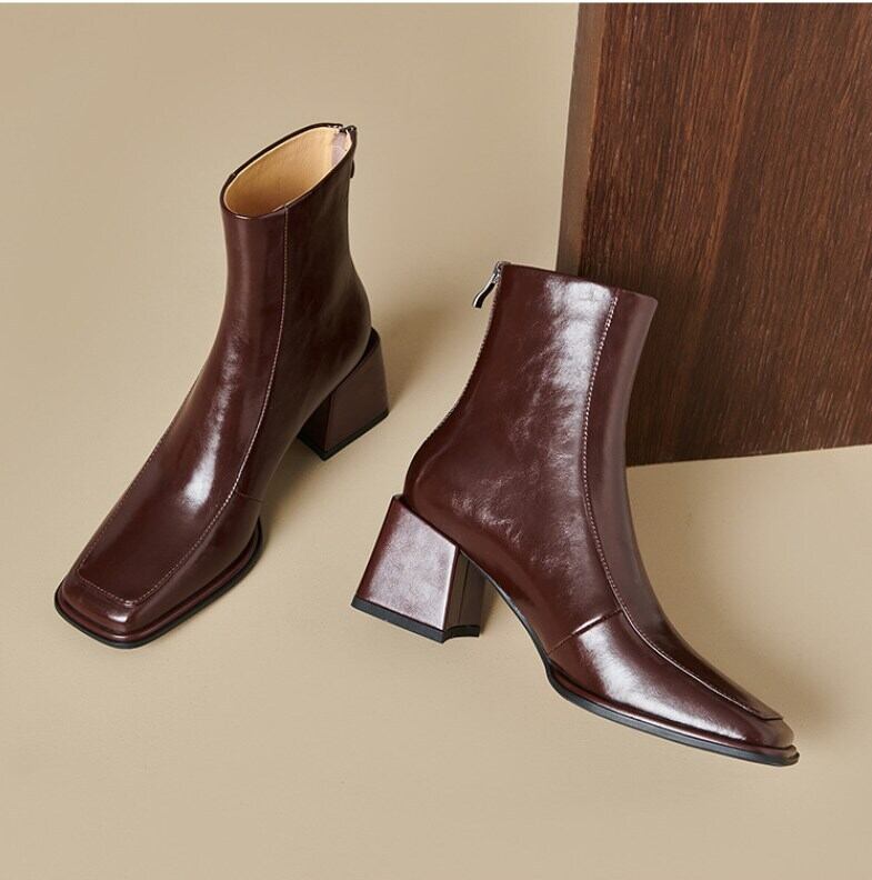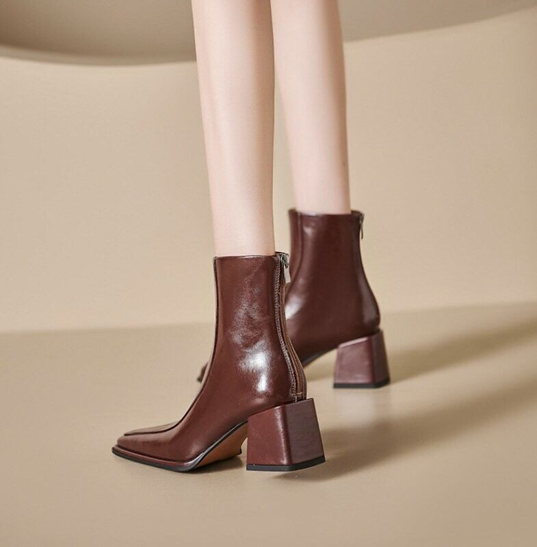 脚をすらりと見せてくれるチャンキーヒールが魅力のショートブーツです。
