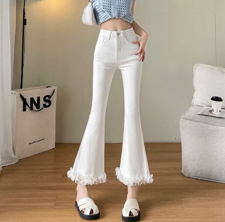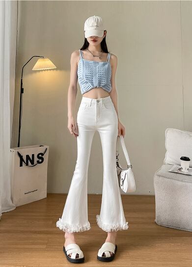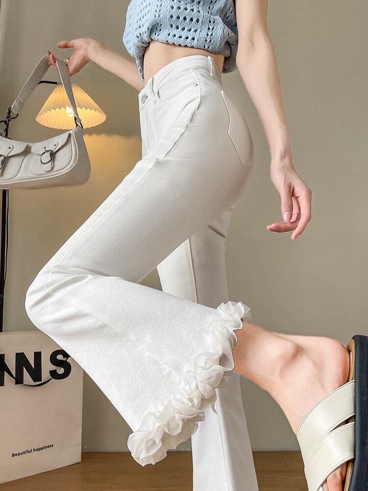 裾のフリルが目を引く、フェミニンなデザインのホワイトパンツ。ハイウエスト仕様で脚長効果があり、すっきりとした美シルエットを演出します。