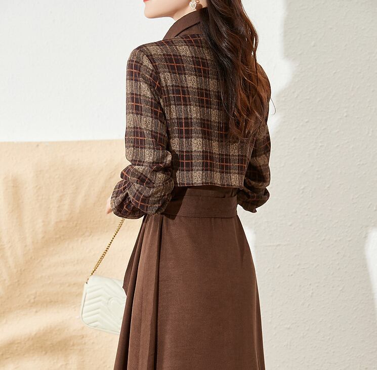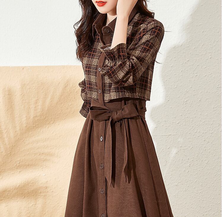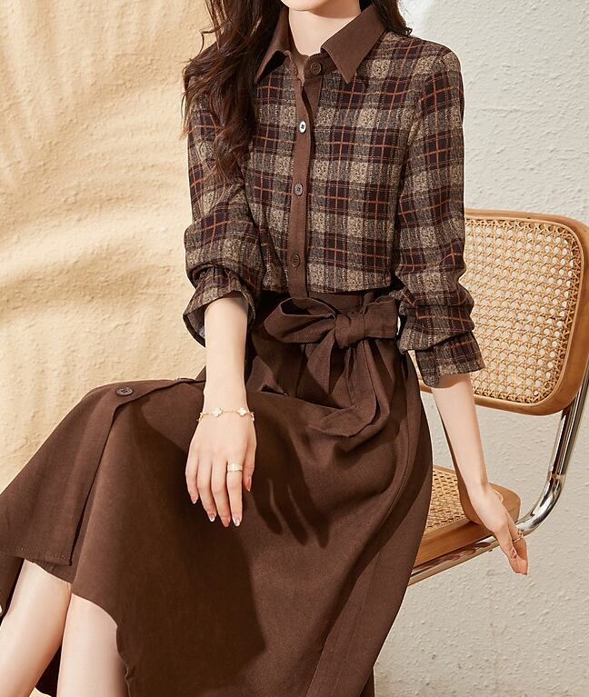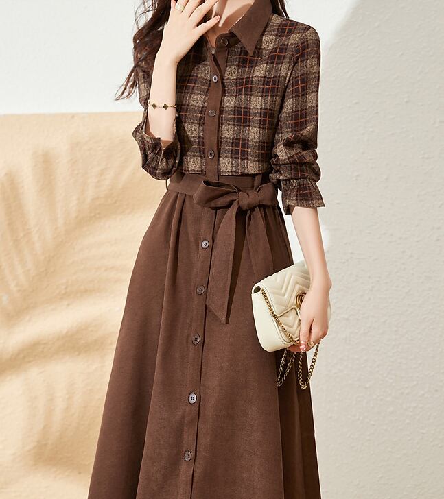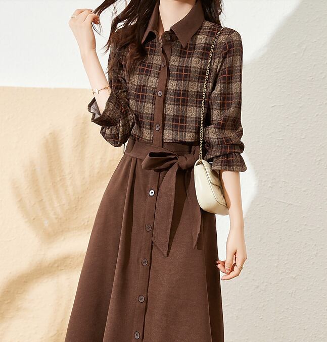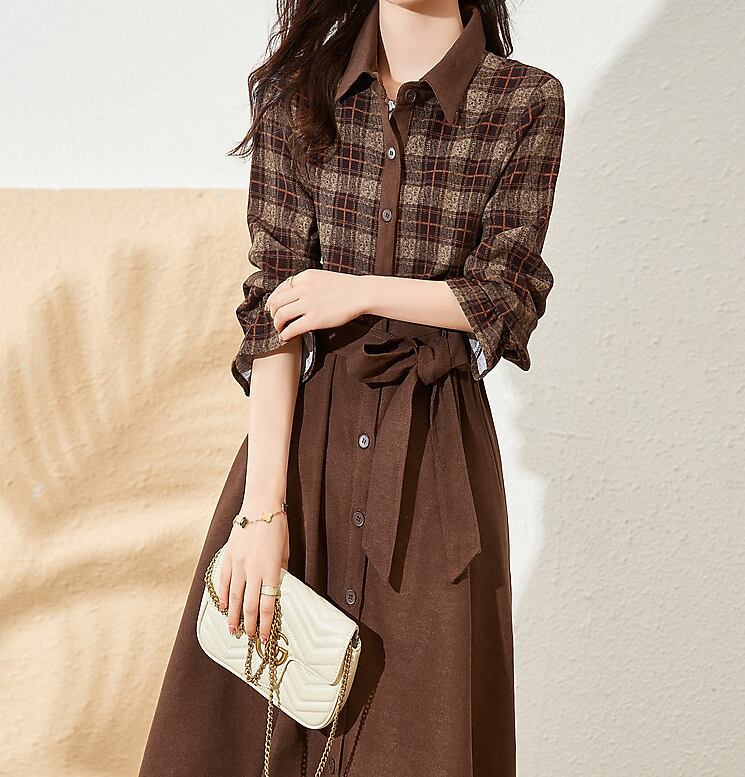 チェック柄と無地のバイカラーがおしゃれなワンピース