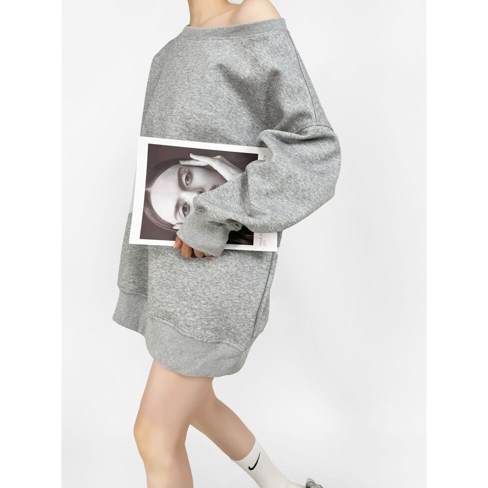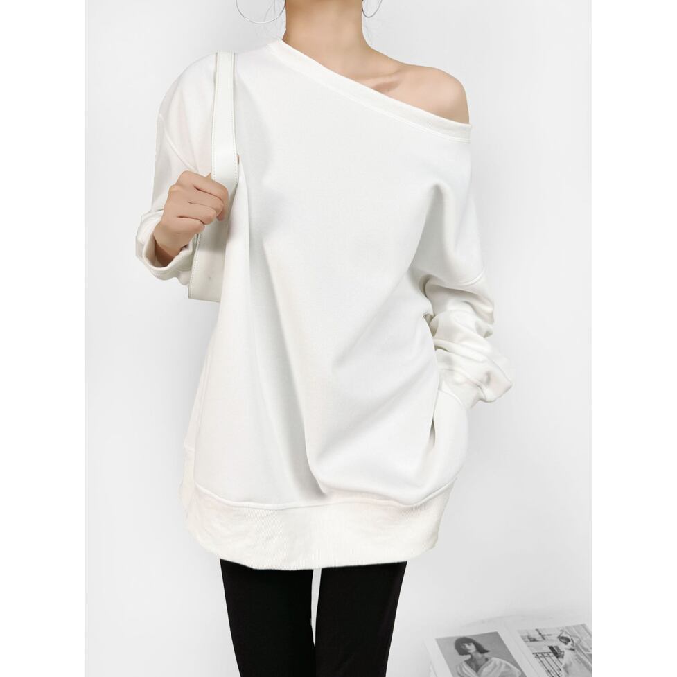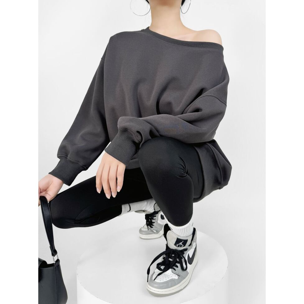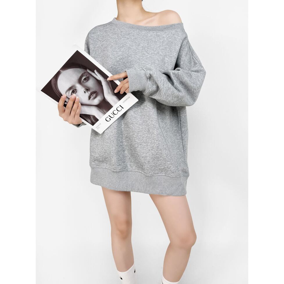 ルーズなワンショルダーシルエットが特徴のビッグスウェット。脱力した雰囲気がめざすのはヘルシーな女らしさ。適度なゆとりで細身とも合わせやすいのも長所。シンプルだけど気の利いた1着。