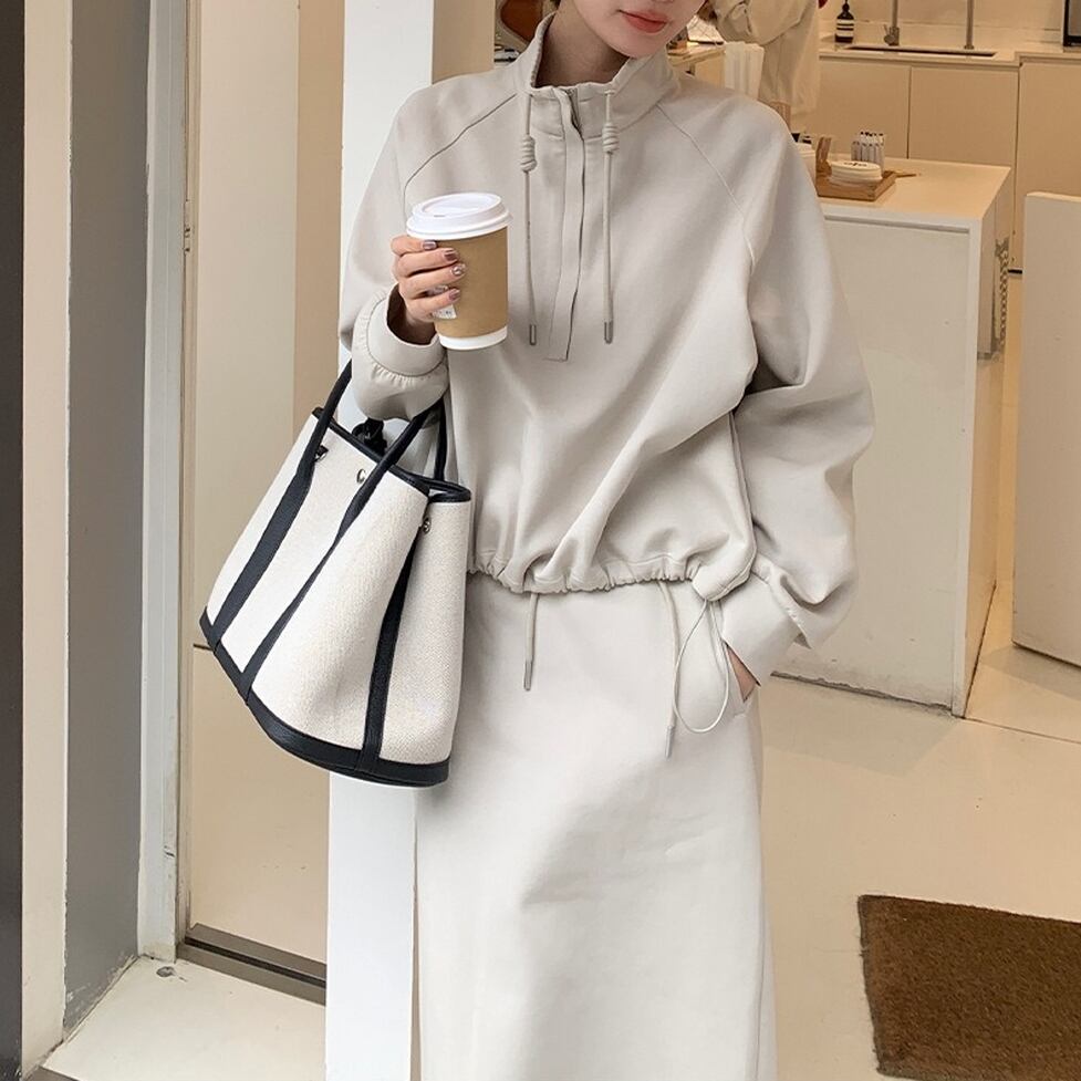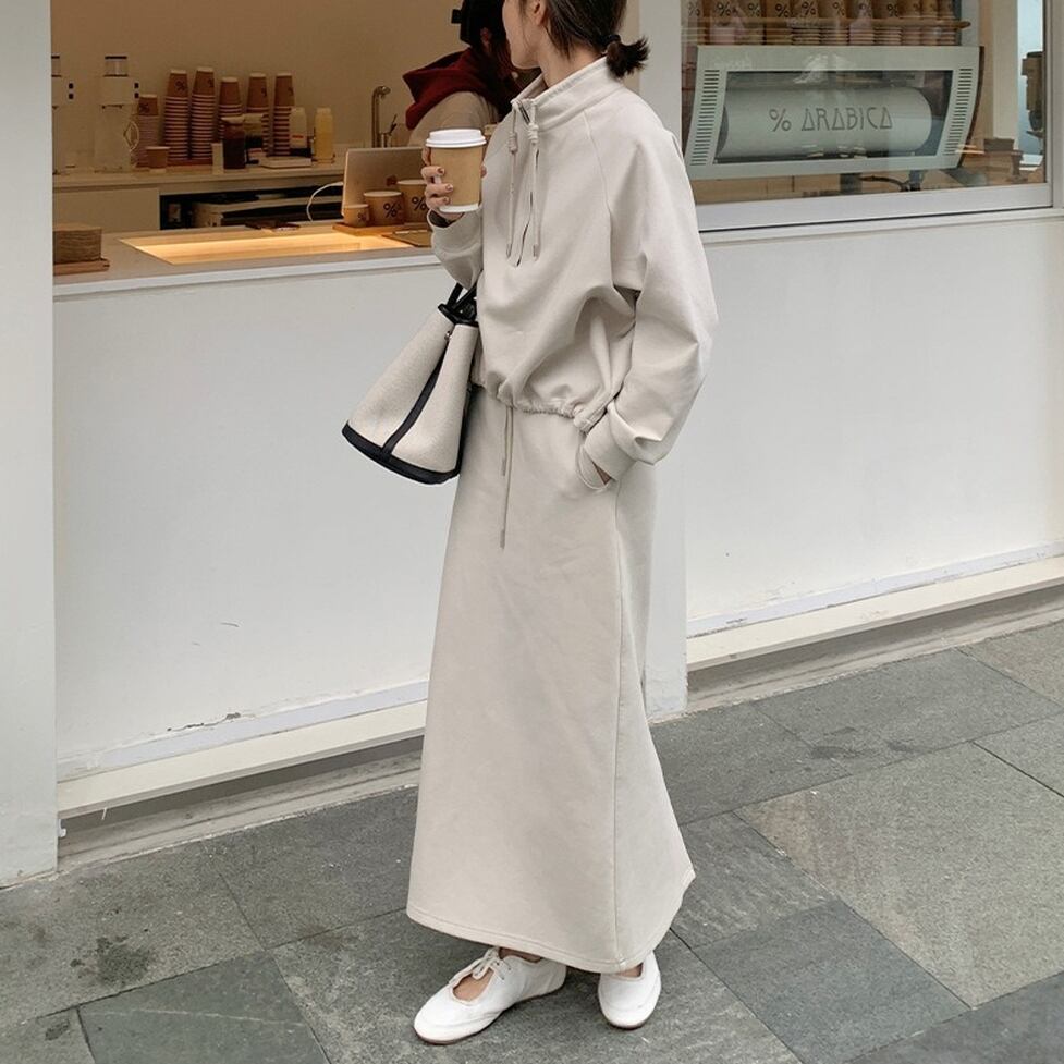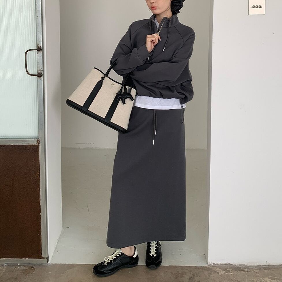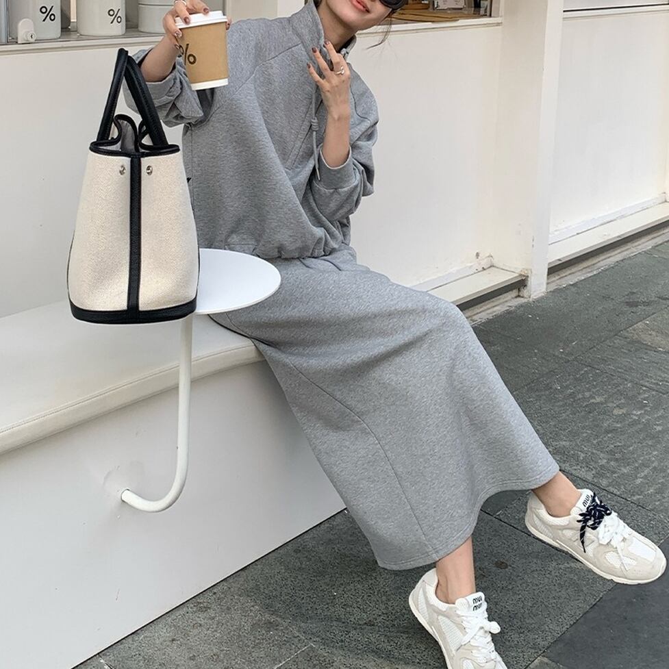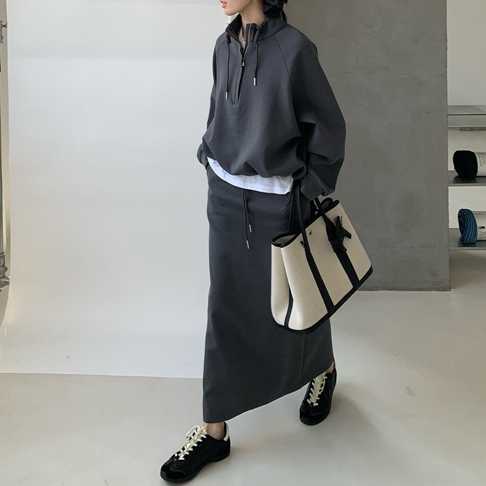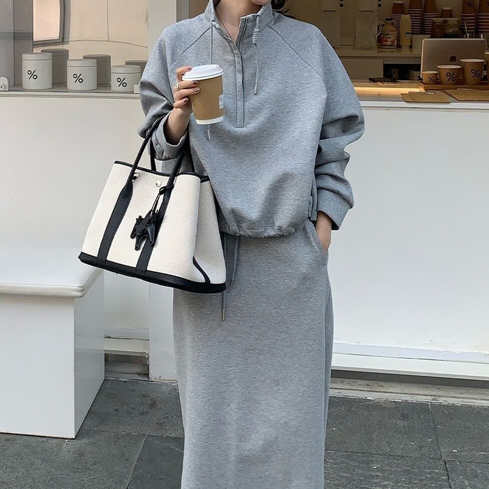 ハイネックのプルオーバーとペンシルスカートのスウェットセットアップ。普遍的なスタイルをこれからに向けて変えていく。スタイルに幅が出せるからワードローブの活性化に有効。テイストを自由に横断できる使い勝手のいい1枚。