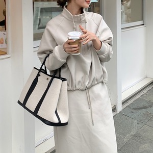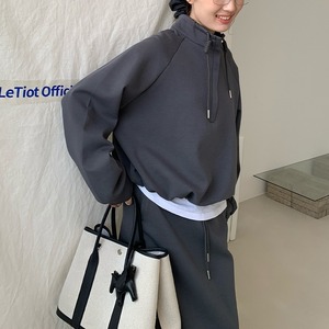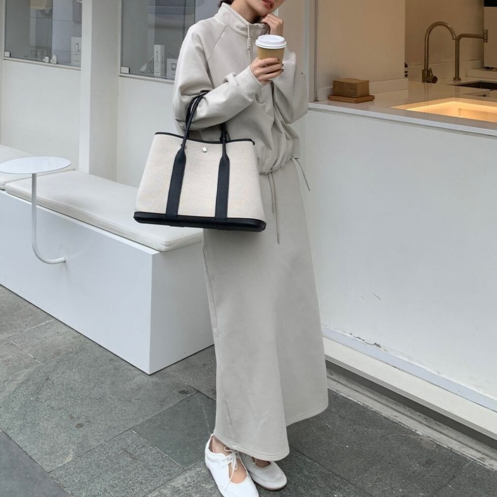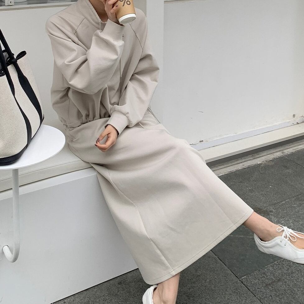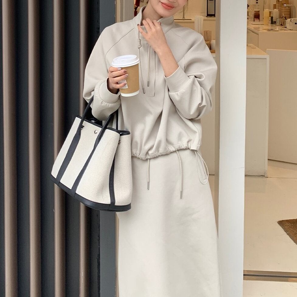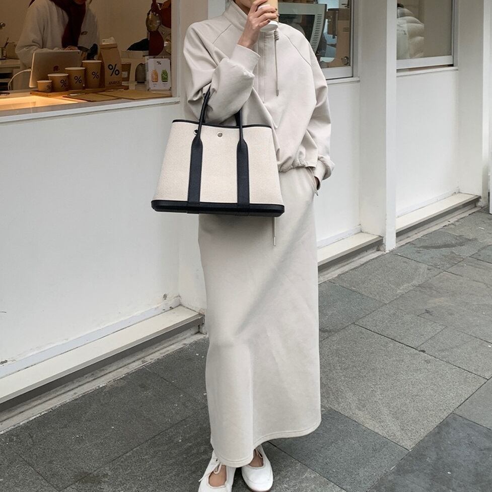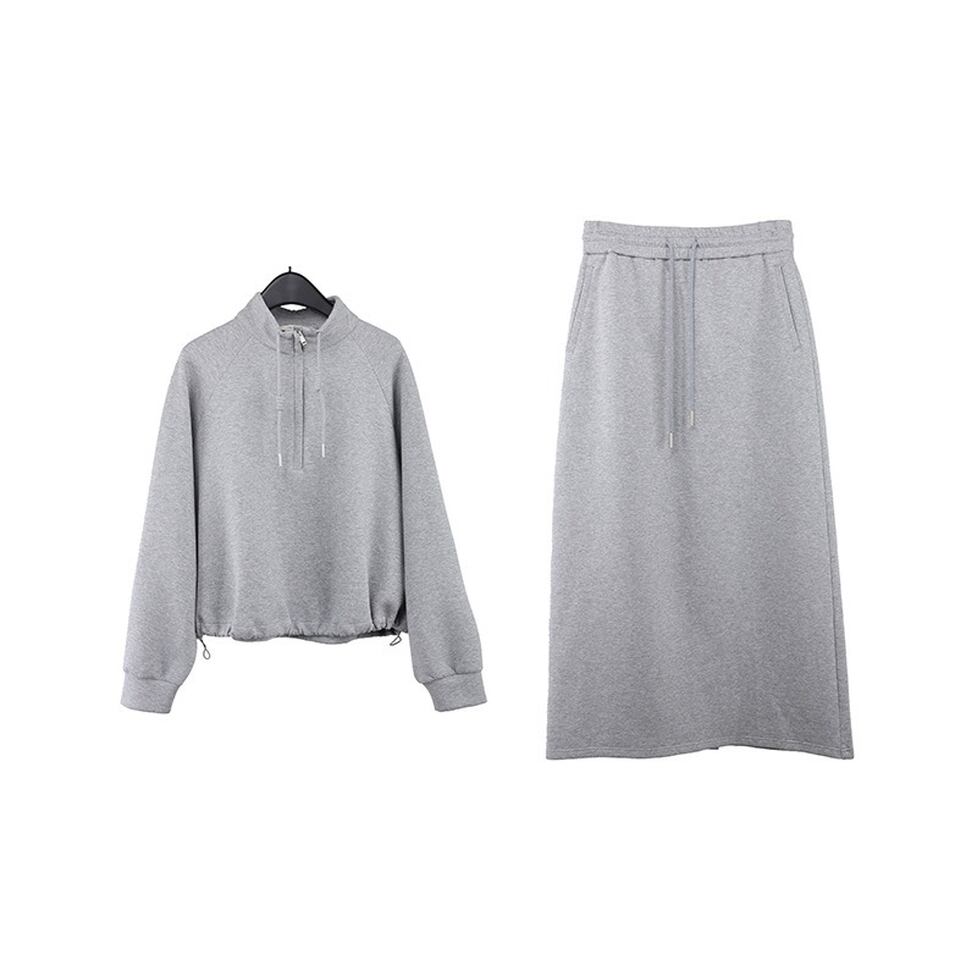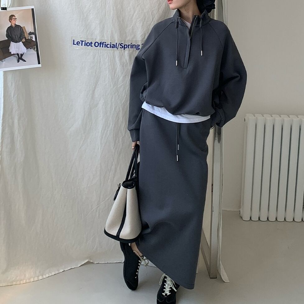 ハイネックのプルオーバーとペンシルスカートのスウェットセットアップ。普遍的なスタイルをこれからに向けて変えていく。スタイルに幅が出せるからワードローブの活性化に有効。テイストを自由に横断できる使い勝手のいい1枚。