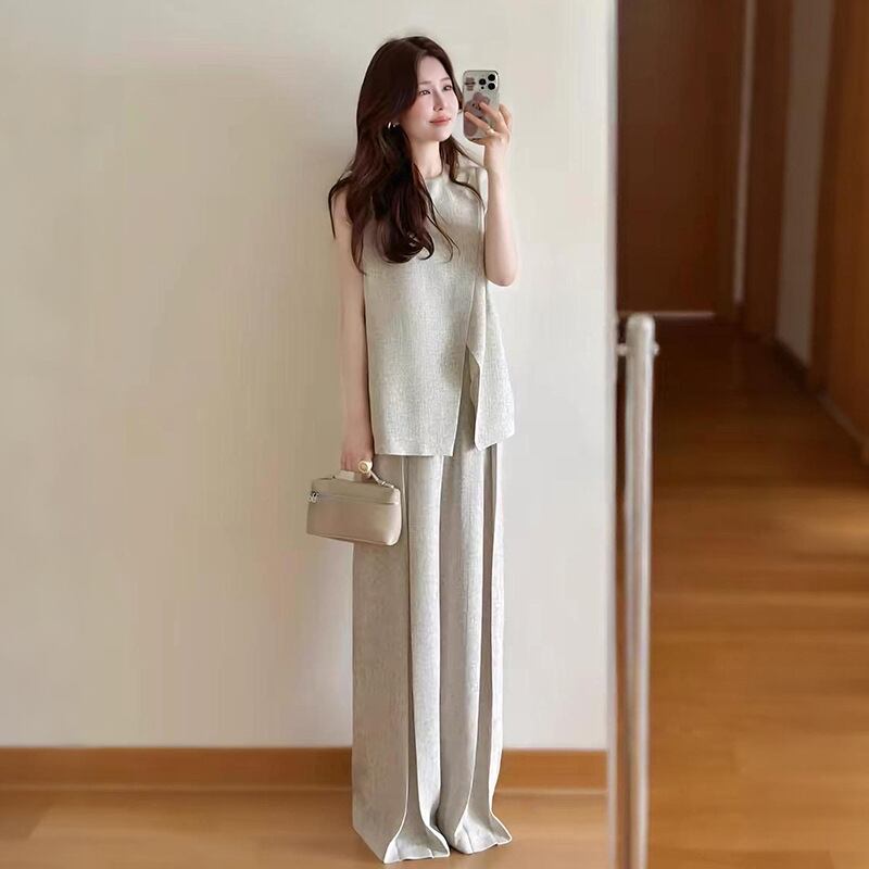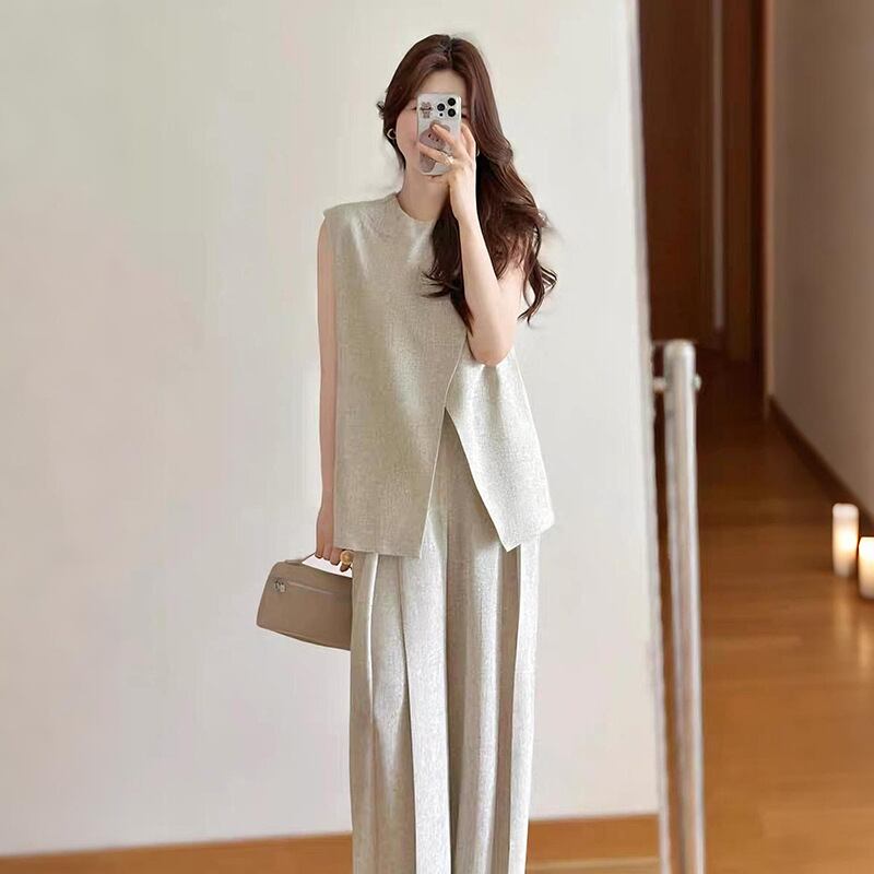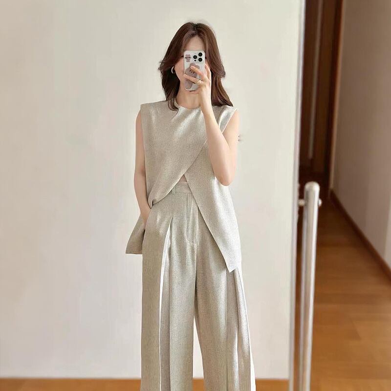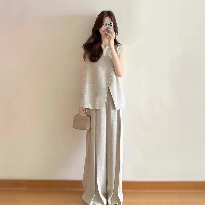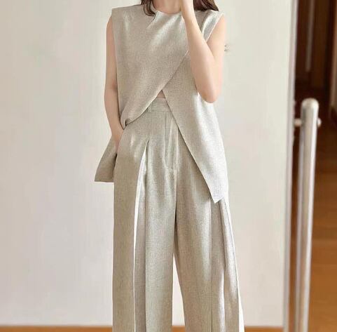 ノースリーブトップスとワイドパンツを組み合わせた、洗練されたレディースセットアップ。アシンメトリーなデザインのトップスがモードな印象を与え、ゆったりとしたパンツが脚長効果を叶えます。