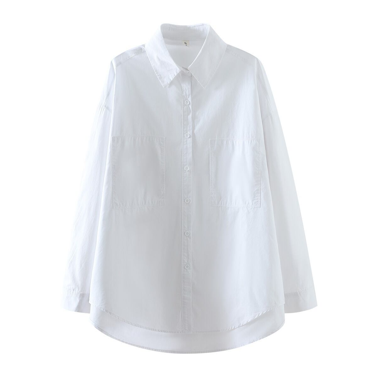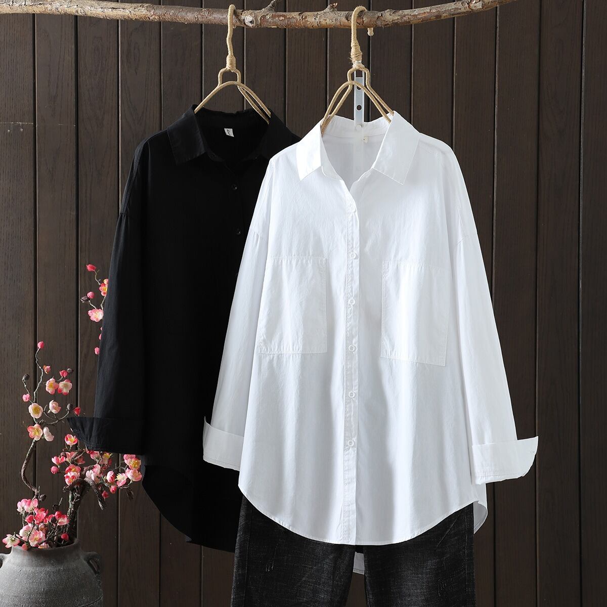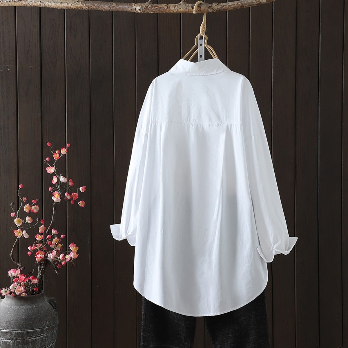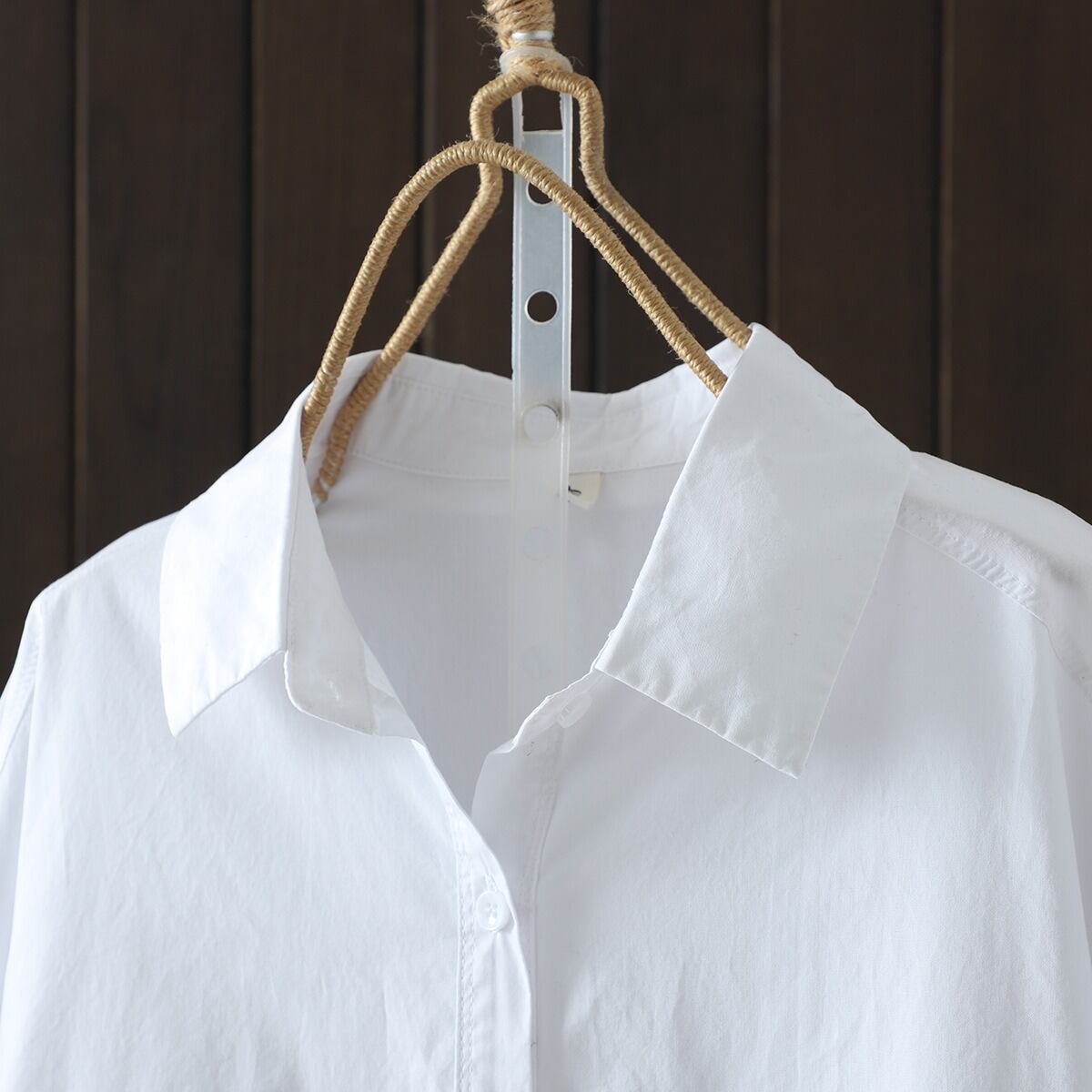 こちらのシャツブラウスは、前開きデザインとミディアム丈の長袖が特徴です。