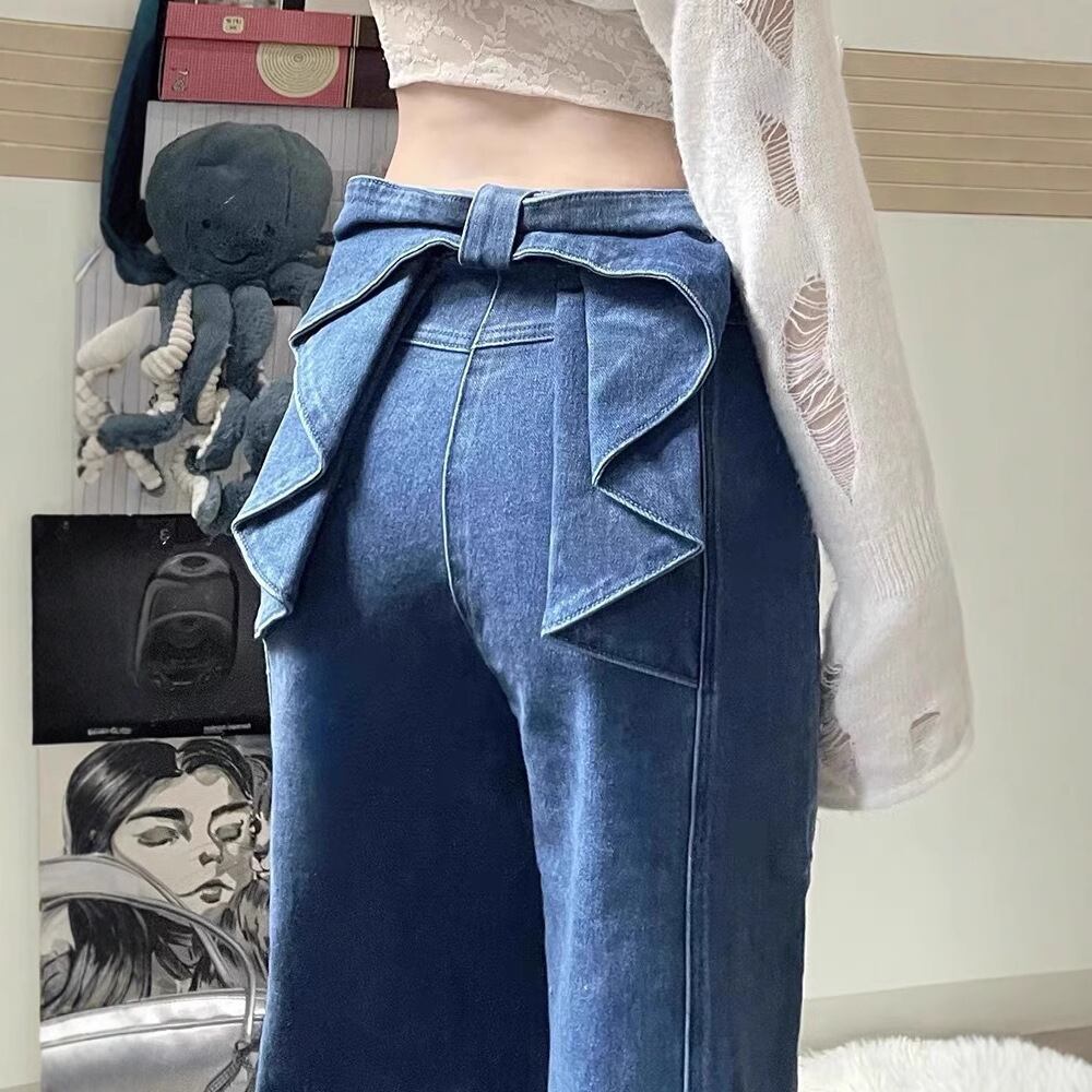 バックスタイルにリボンディテールをあしらった、遊び心あふれるデニムパンツ。シンプルなフロントとは対照的に、後ろ姿で差がつくデザインで、こなれ感と女性らしさを演出してくれます。