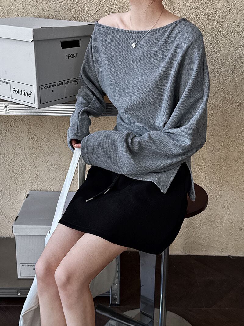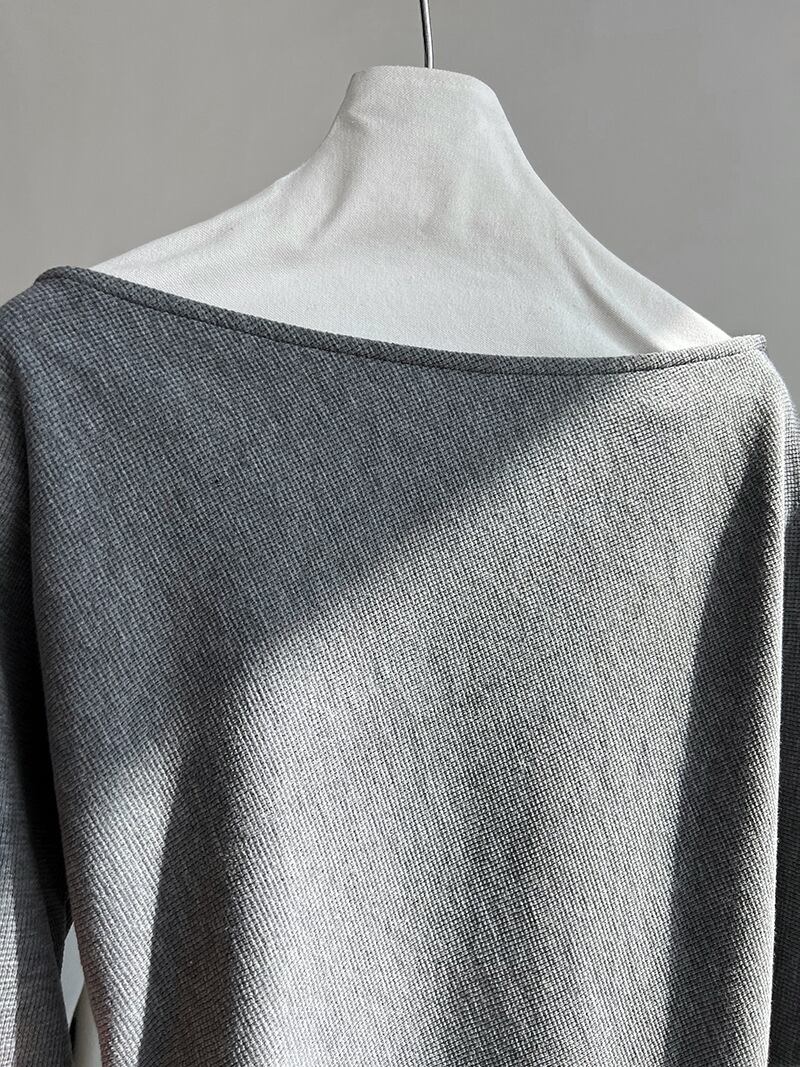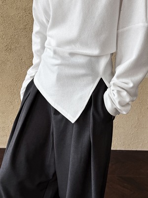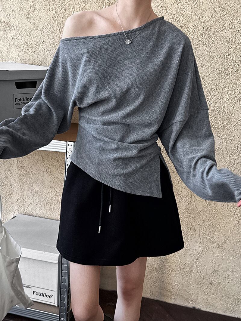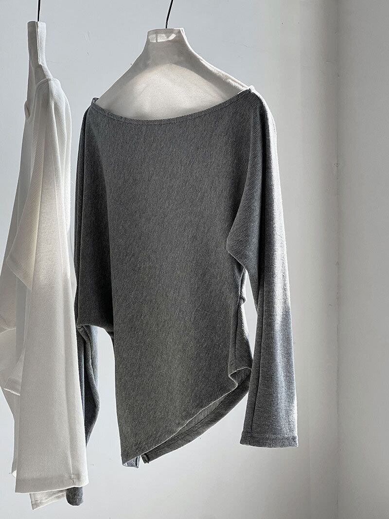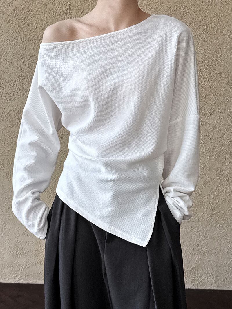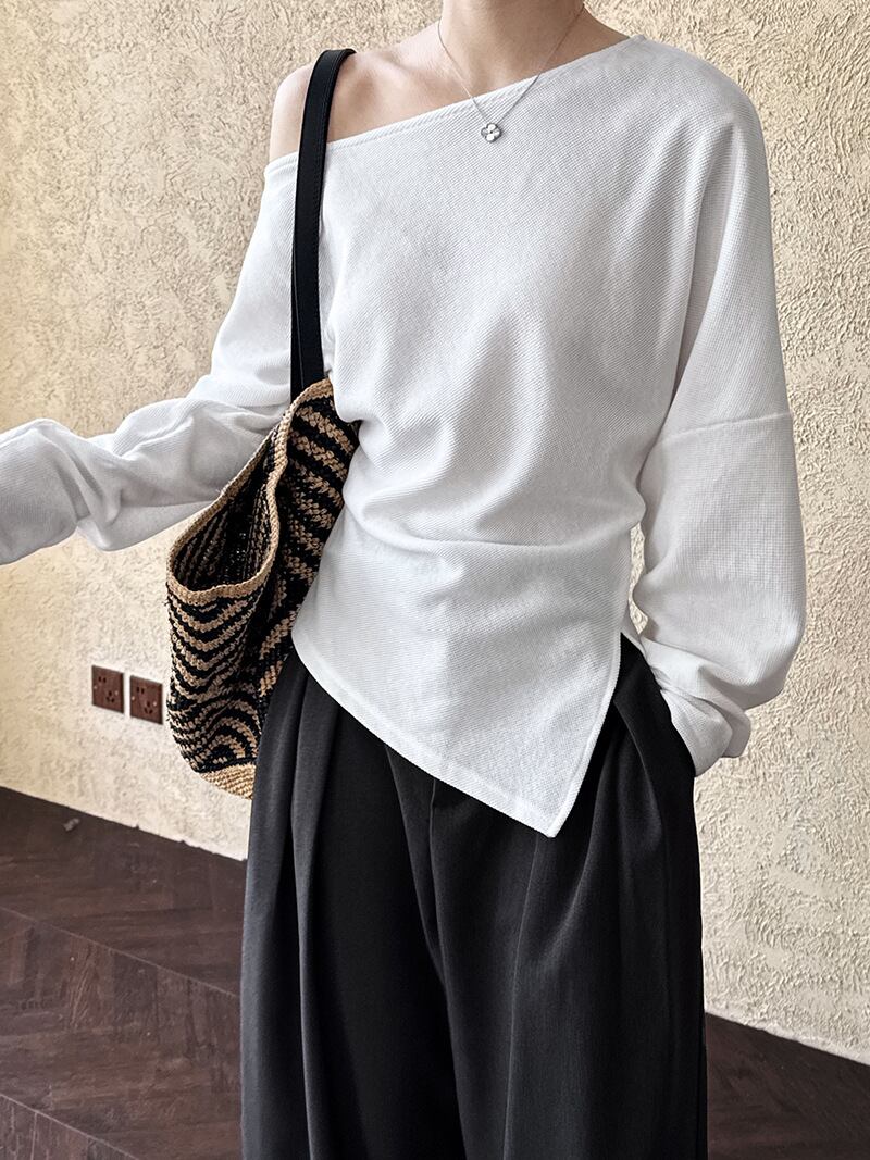 アシンメトリーな裾デザインと、ワンショルダー風のネックラインが印象的な長袖カットソー。シンプルながらもモード感漂うディテールで、コーディネートにこなれ感をプラスしてくれます。