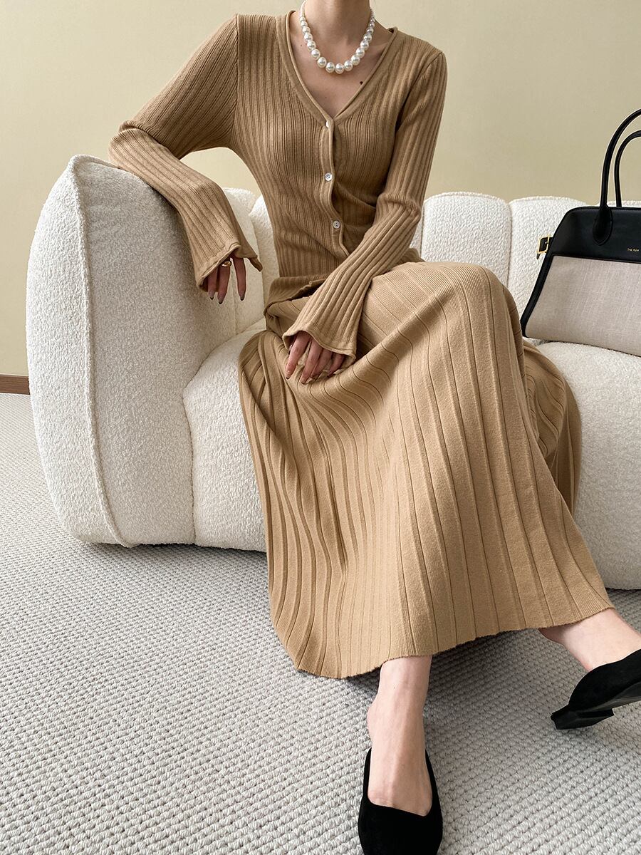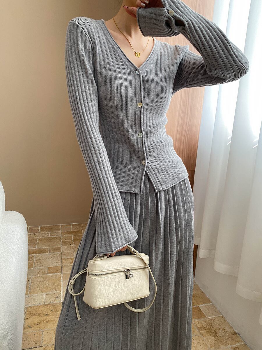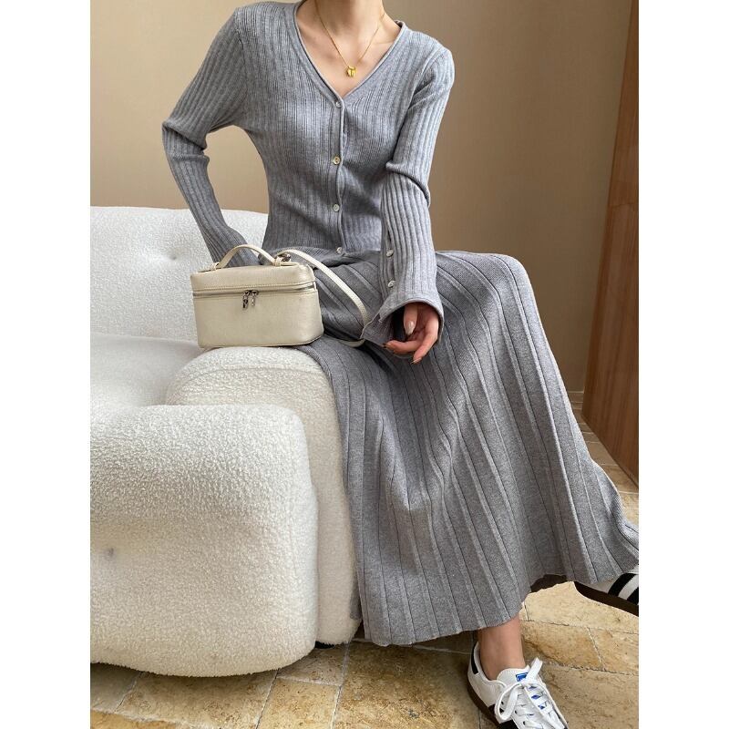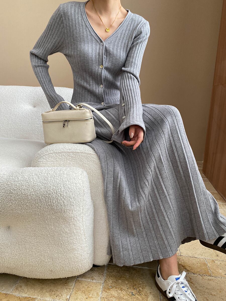 大人可愛いスタイルを楽しめるツーピース。Vネックと前開きボタンがすっきりとした印象を演出し、シンプルながらも存在感のある着こなしを叶えます。