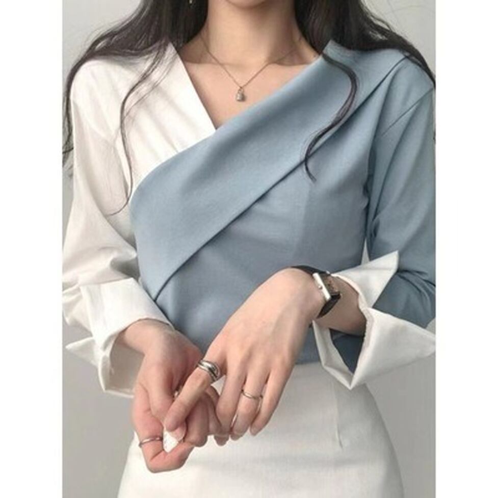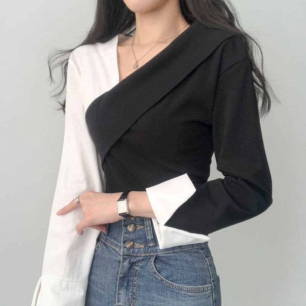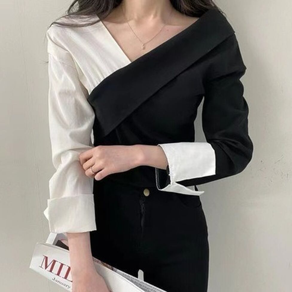 バイカラーのアシンメトリーデザインが特徴のトップス。スタイルをキープしつつも力の抜けたバランスに。凜とした強さを補うドレス手前のシルエットも日常へとけ込む。やわらかさとシャープさが同居した新風を