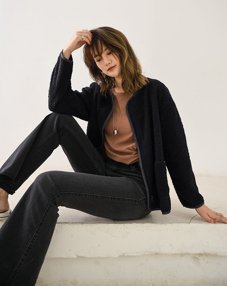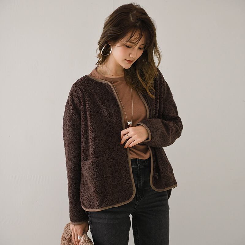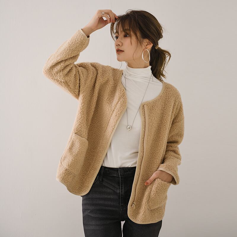 もこもこのボア素材で、温かみのある中厚手の仕上がりです。長袖のラウンドネックデザインは、フェミニンさとカジュアルさを兼ね備え、大人可愛い雰囲気を演出します。ポケット付きで実用性も充実し、ファスナー開閉で着脱も簡単。シンプルながらも、一枚羽織るだけでこなれ感を引き立てるアイテムです。