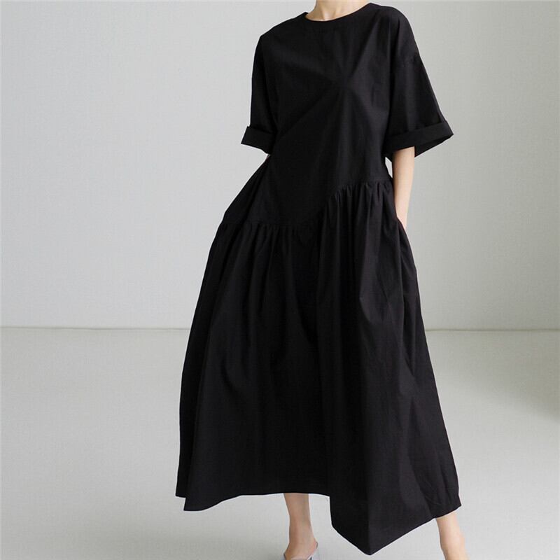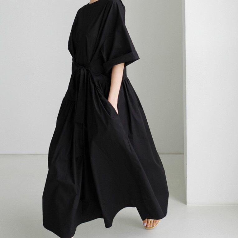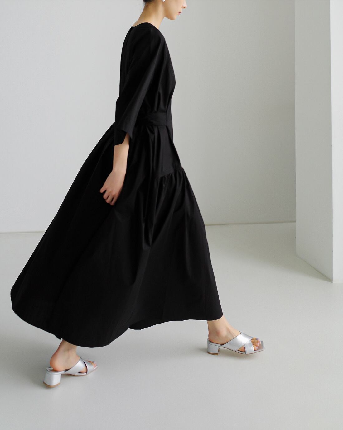シンプルながらも存在感を放つブラックのロングワンピース。ふんわり広がるAラインシルエットが、動きに合わせて優雅に揺れ、女性らしい雰囲気を引き立てます。