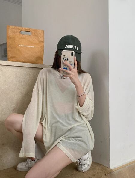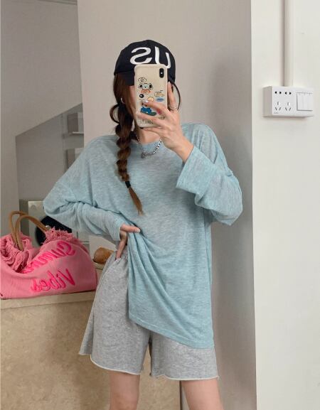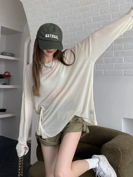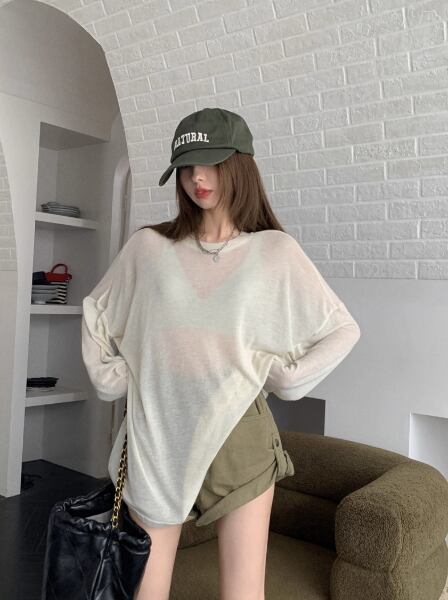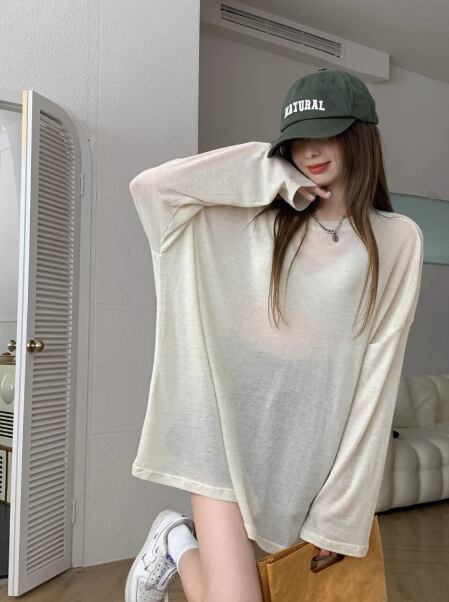 軽やかな透け感が魅力のラウンドネック長袖トップス。シンプルながらも程よい抜け感があり、カジュアルな着こなしからリゾートシーンまで幅広く活躍します。