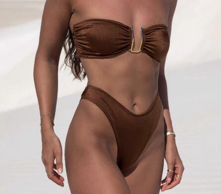太陽の下で映える、シンプルながら洗練された大人のビキニ。肩のラインをすっきり見せるバンドゥデザインで、背中を大胆に見せつつも上品な印象を演出します。脚を長く魅せるハイレグカットが、美脚効果とスタイルアップを叶えてくれます。