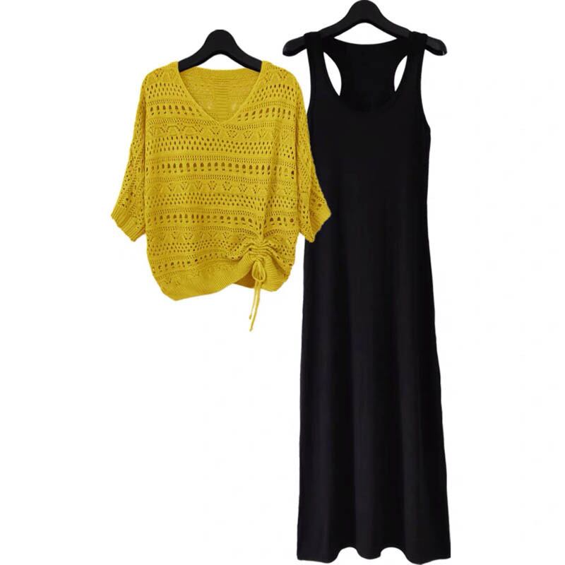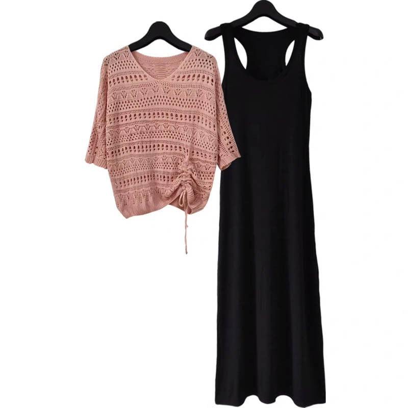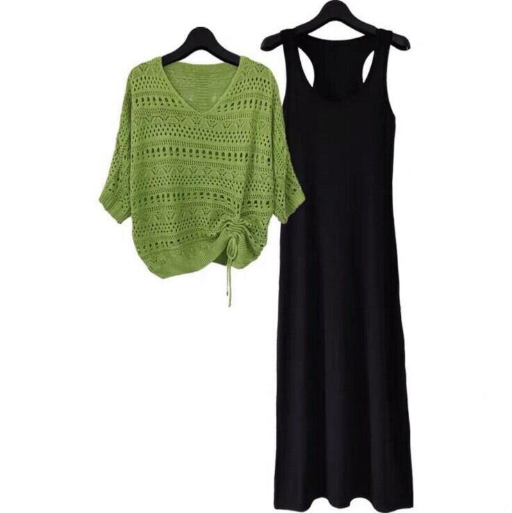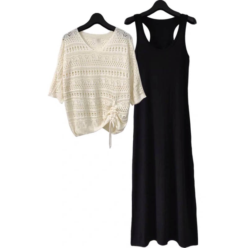 透かし編みニットと、シンプルなブラックワンピースがセットになったレディースツーピース。重ねて着ればナチュラルなレイヤードコーデが完成し、それぞれ単品でも着回せる万能アイテムです。