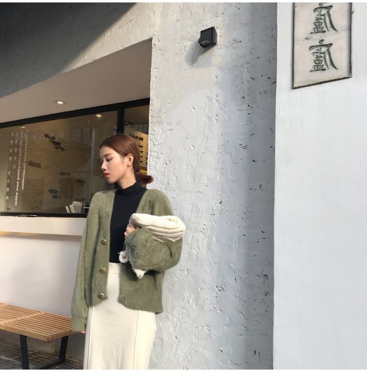 前開きデザインとボリューム袖が特徴で、シンプルながらもおしゃれな雰囲気を漂わせます。ショート丈でIラインシルエットを強調し、体型をさりげなくカバーする一着です。