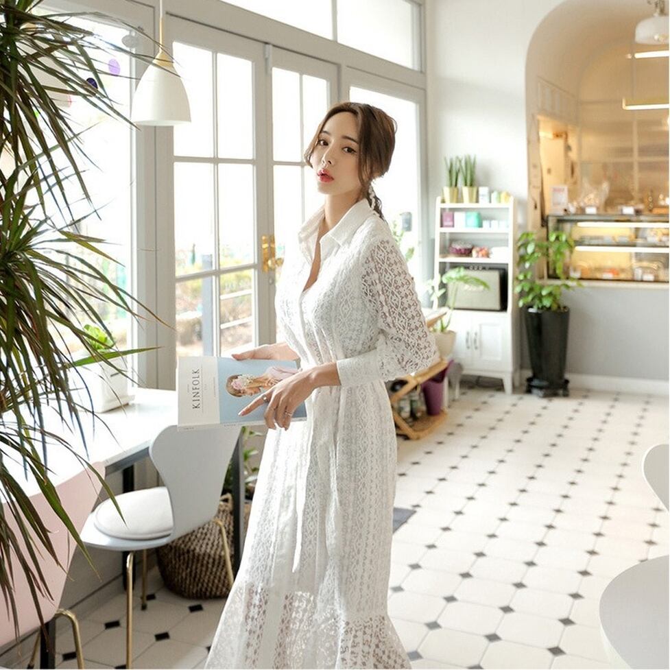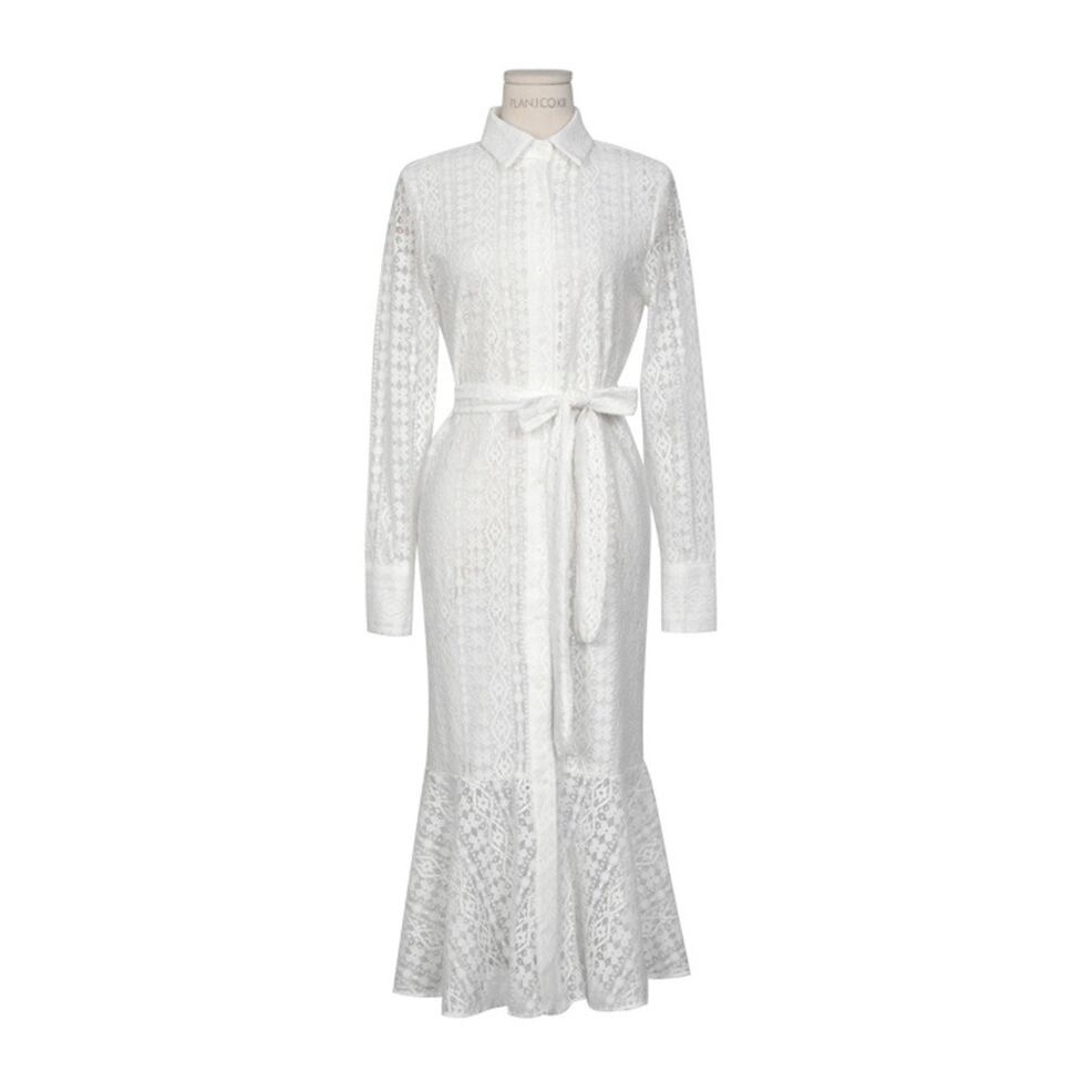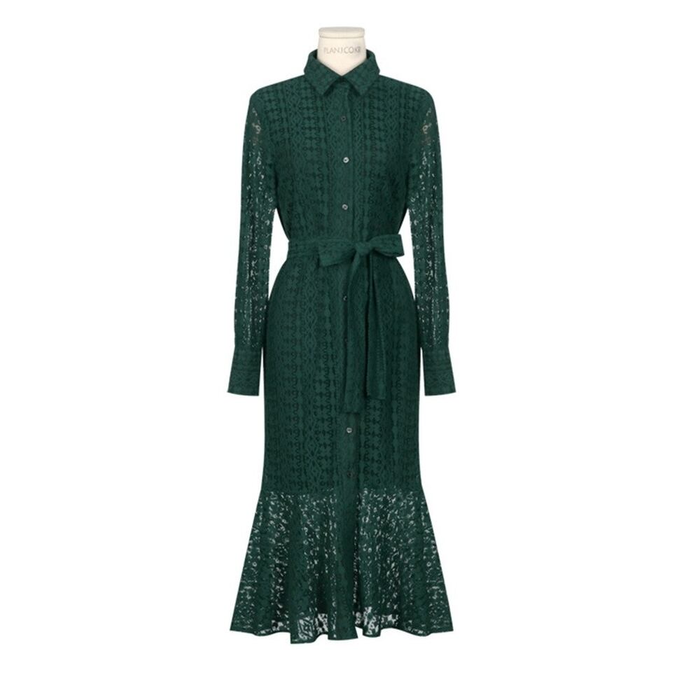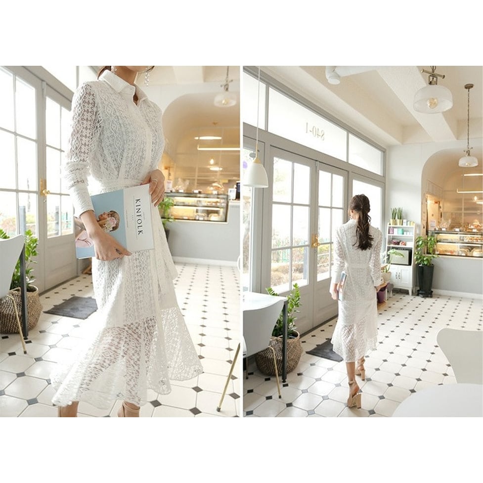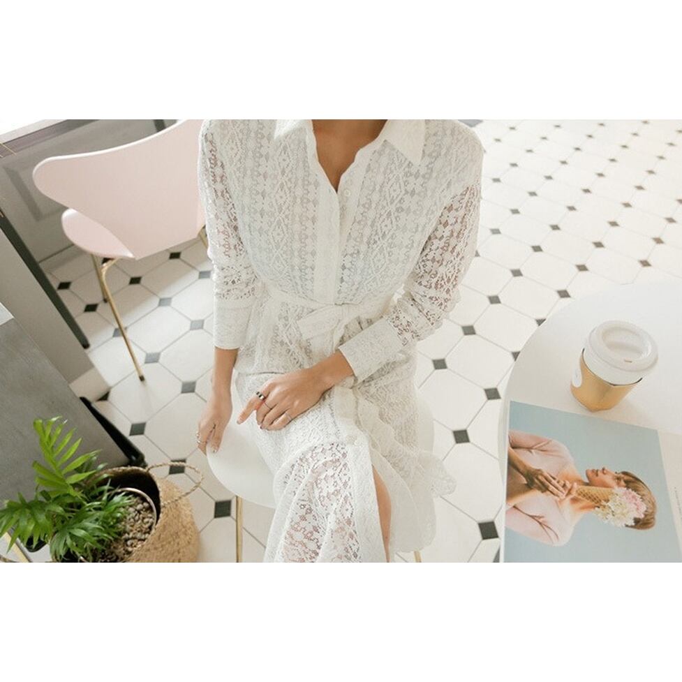 華やぐレースで奥行きを表現した総レースシャツワンピース。ゆとりのあるマーメイドシルエットで躍動感も表現。繊細な透け感が上品に映えて大人な女性の雰囲気を醸し出すアイテム。