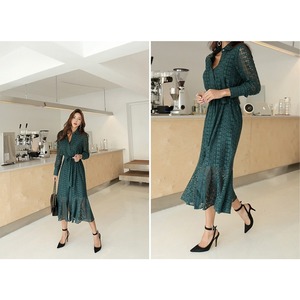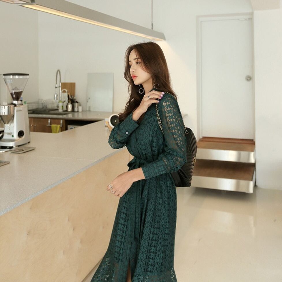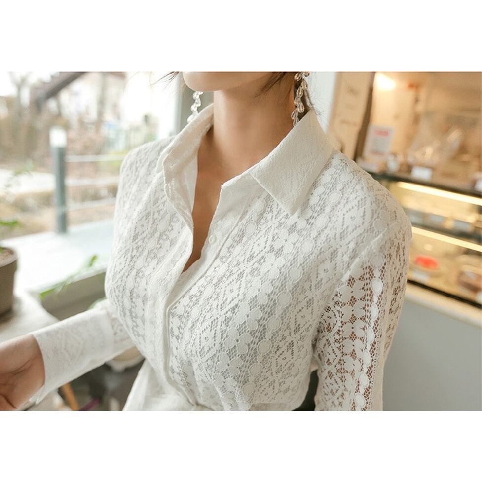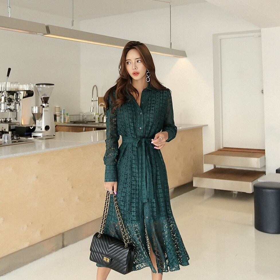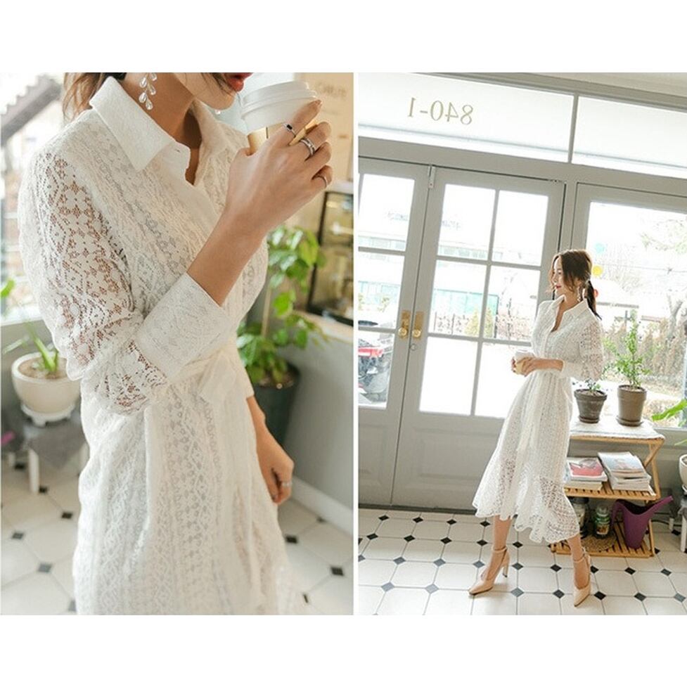 華やぐレースで奥行きを表現した総レースシャツワンピース。ゆとりのあるマーメイドシルエットで躍動感も表現。繊細な透け感が上品に映えて大人な女性の雰囲気を醸し出すアイテム。