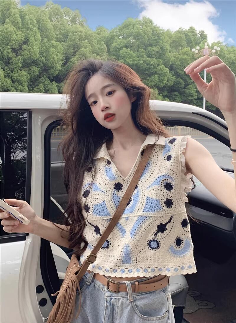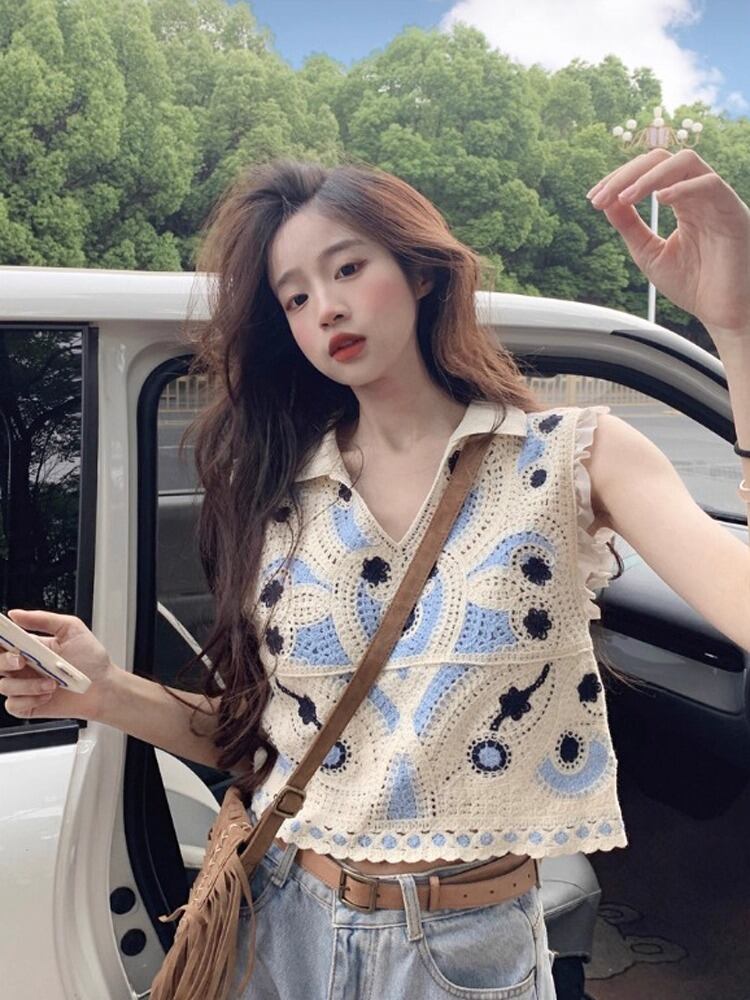 ノースリーブデザインとVネックが上品さを演出し、襟付きのレースや刺繍が施された薄手素材は、春夏にぴったりな一着です。