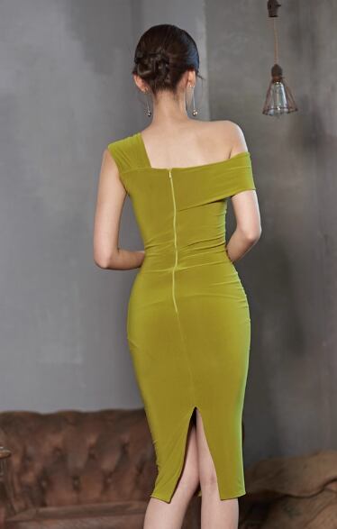 エレガントな印象を引き立てる、レディース膝丈ワンピース。片方の肩を美しく魅せるワンショルダーデザインが、シンプルながらも都会的でセクシーな雰囲気を演出します。スリムなシルエットとファスナー仕様で、スタイルアップ効果も抜群です。