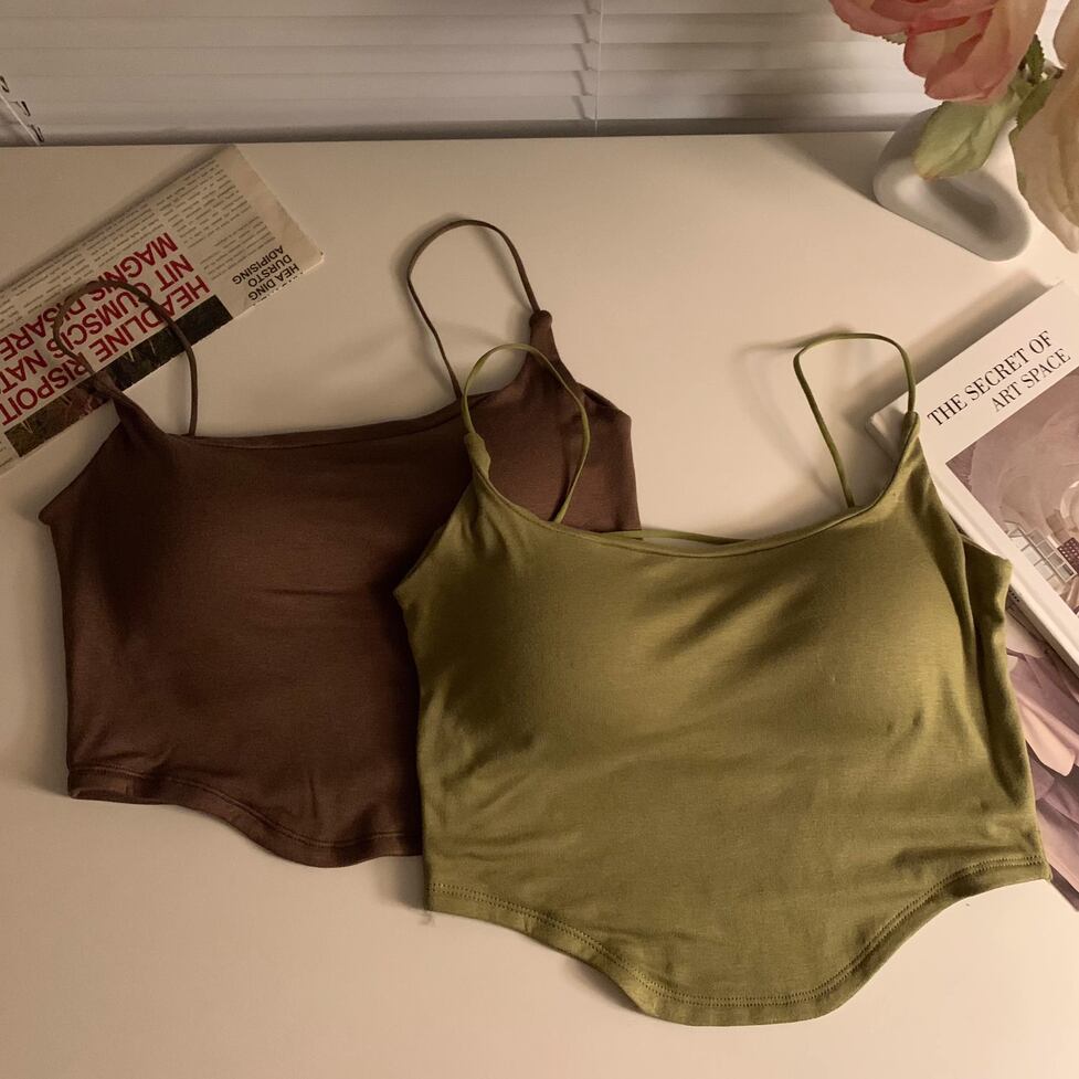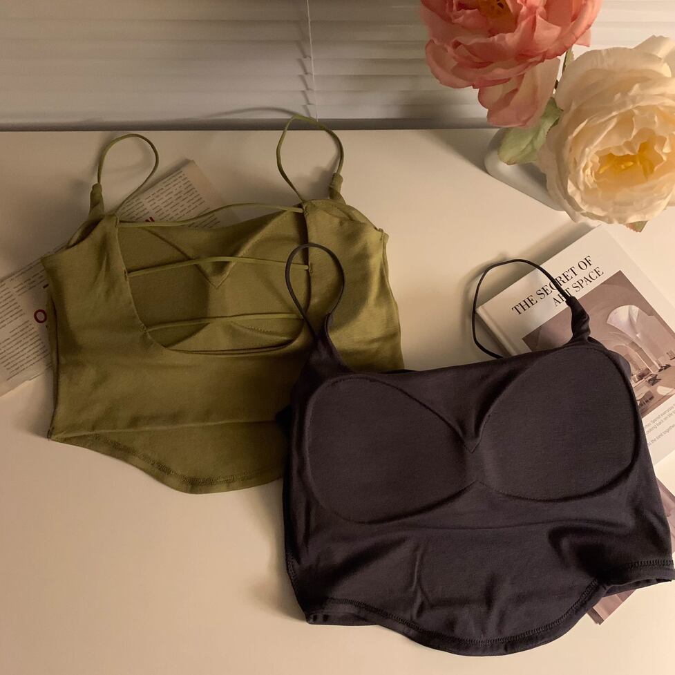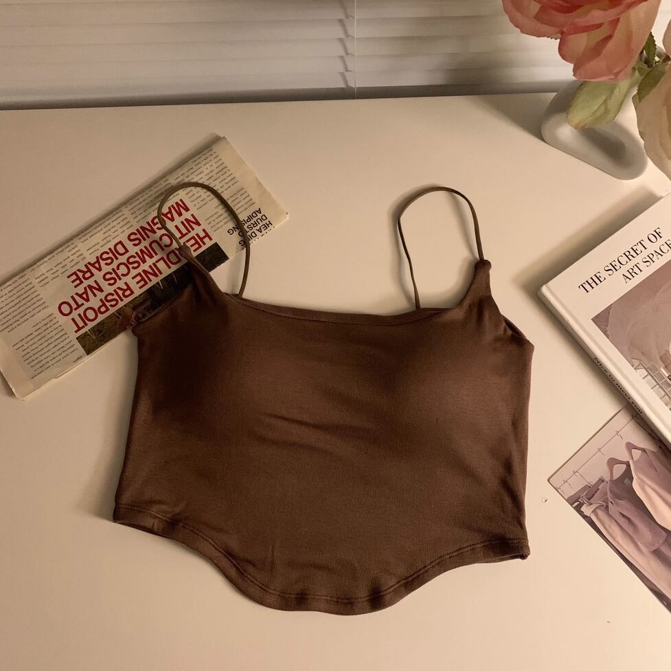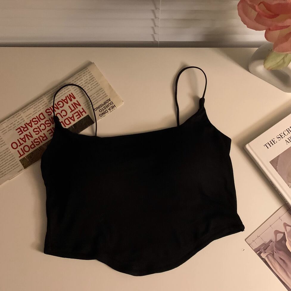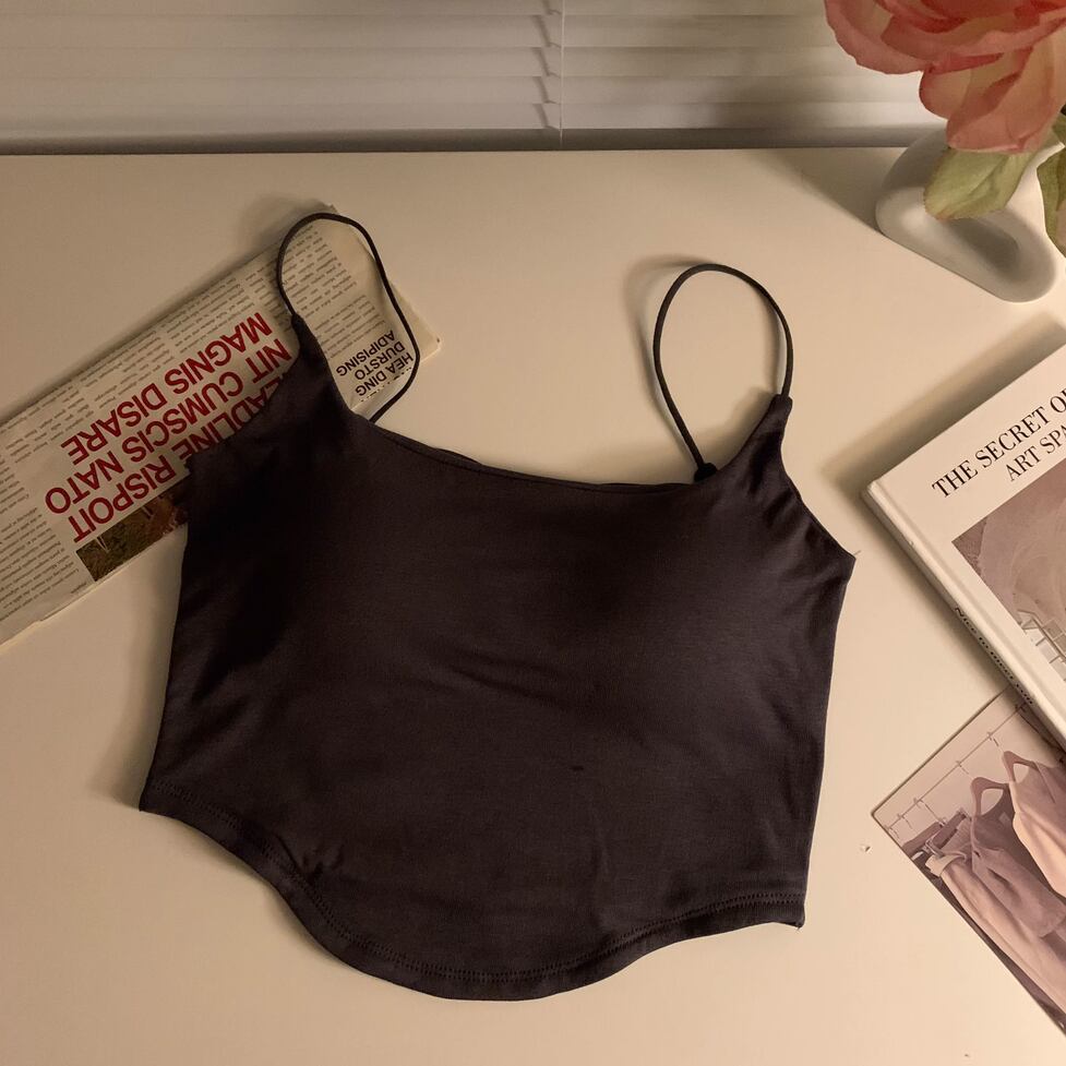 裾の曲線に華奢なストラップのクロップドキャミソール。コンパクトなショート丈でかわいい。体を華奢に見せるくびれたシルエット。鎖骨まわりをシャープに見せる。