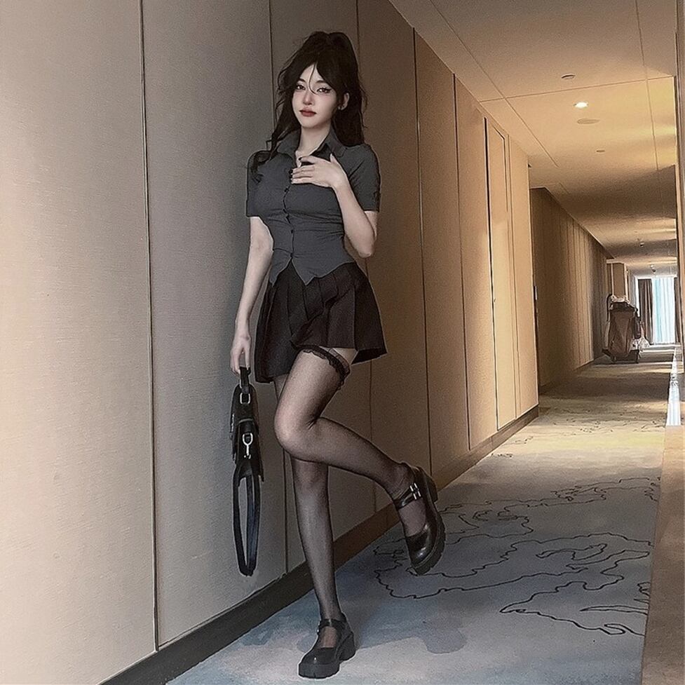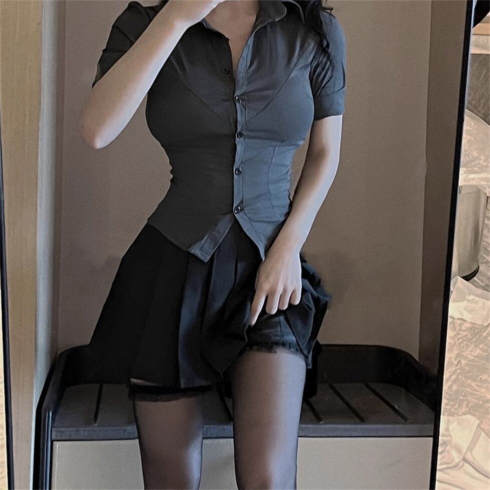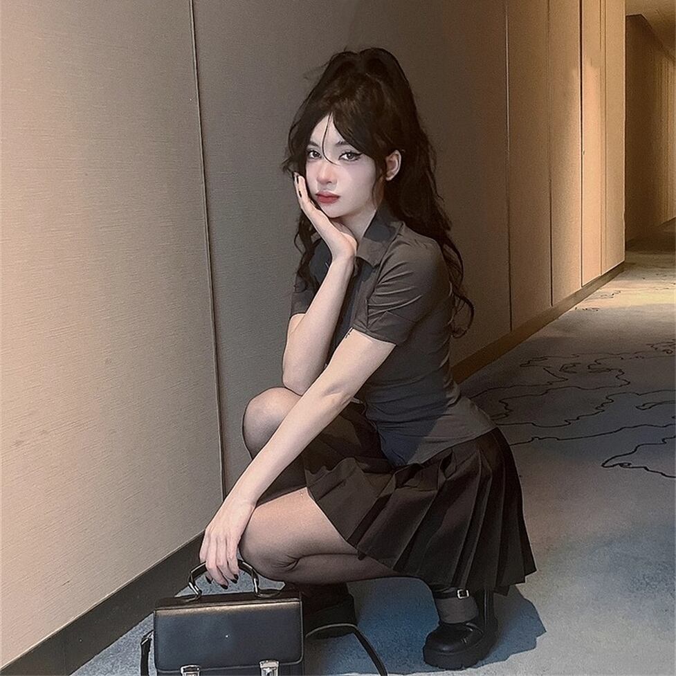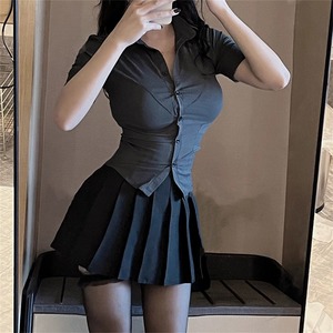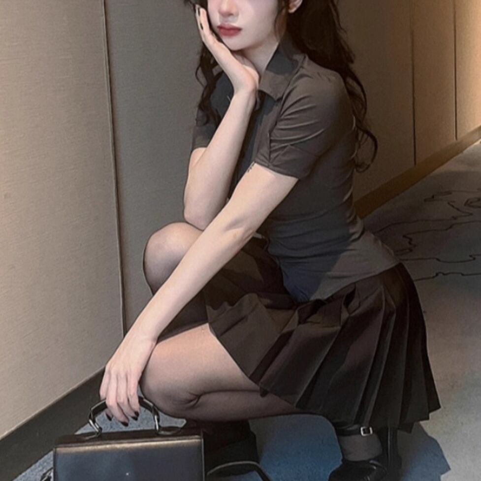 タイトな襟付き半そでシャツとかわいいミニプリーツスカートのセットアイテム。華奢見えできるメリハリフォルム。脚線をキレイに見せるちょうどいい大人の甘さのさじ加減にも技が光る。