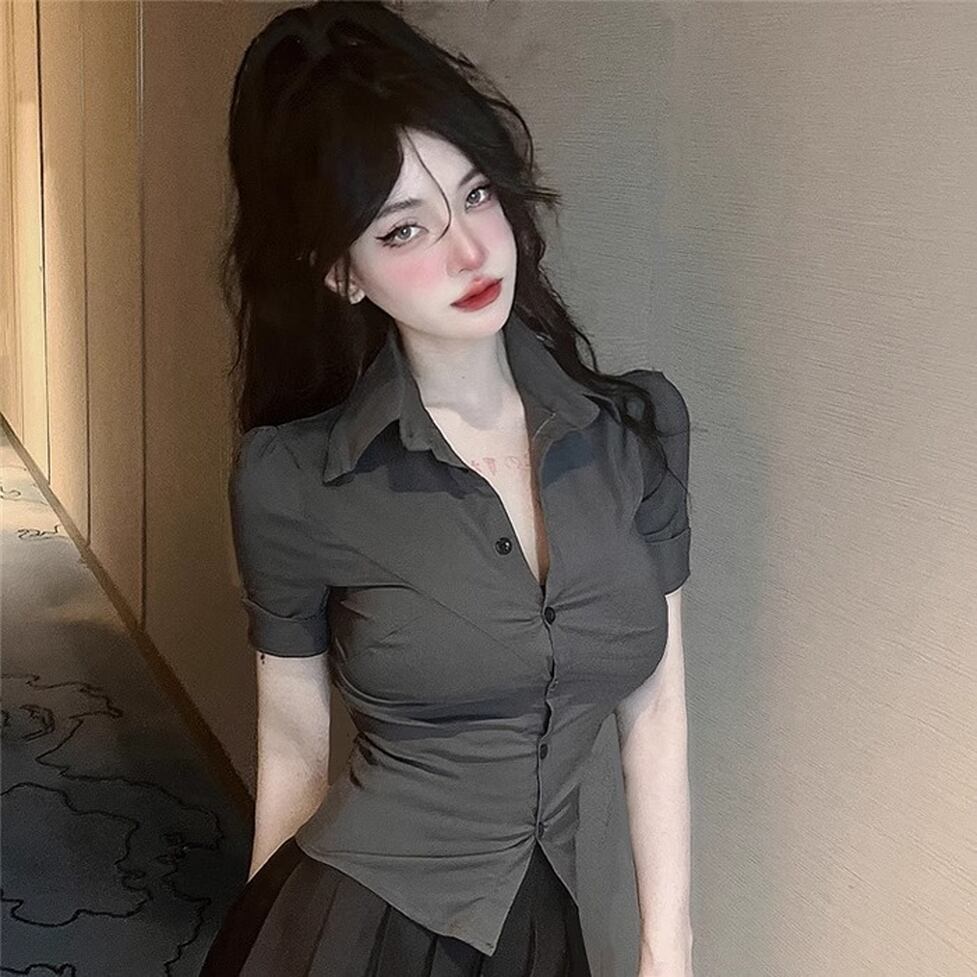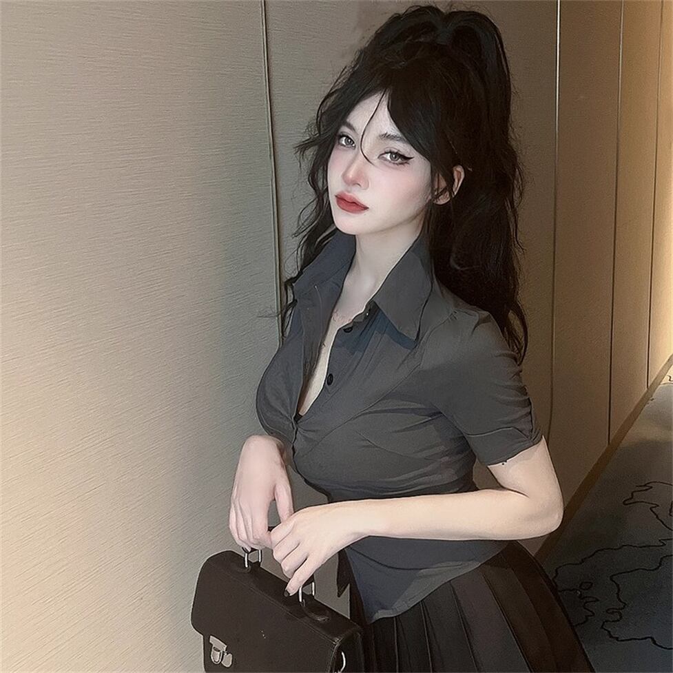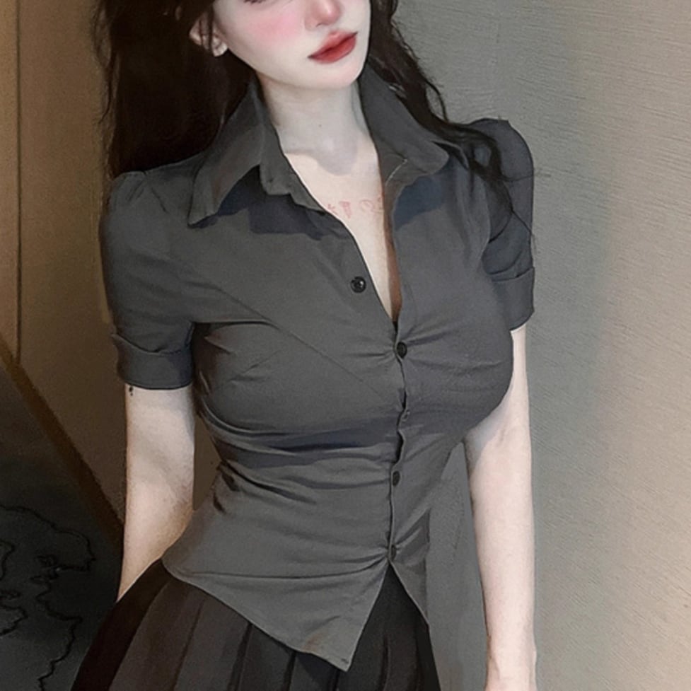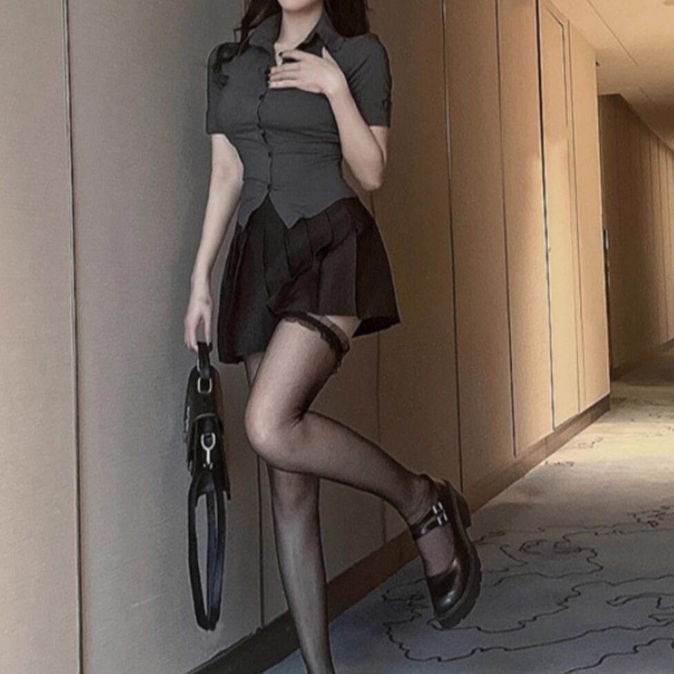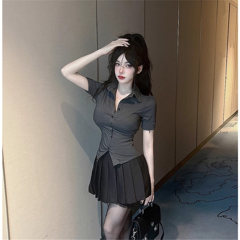 タイトな襟付き半そでシャツとかわいいミニプリーツスカートのセットアイテム。華奢見えできるメリハリフォルム。脚線をキレイに見せるちょうどいい大人の甘さのさじ加減にも技が光る。