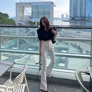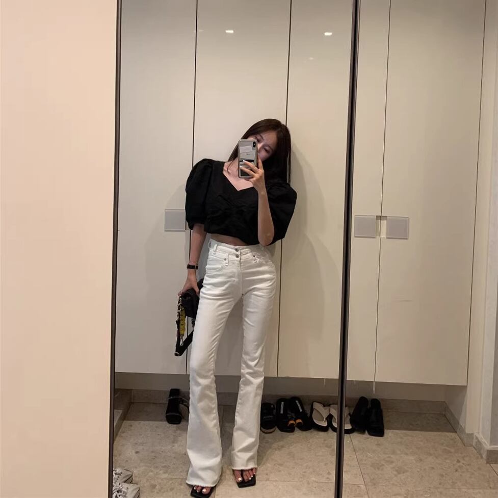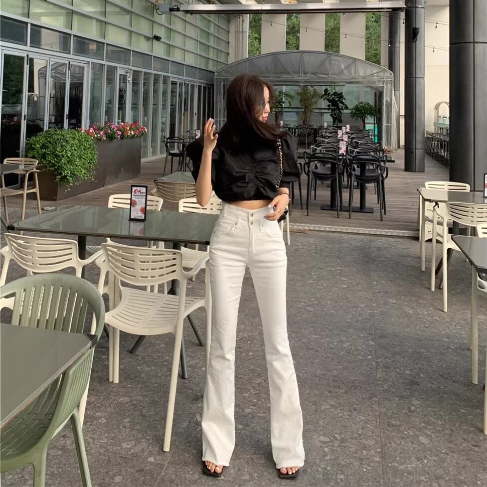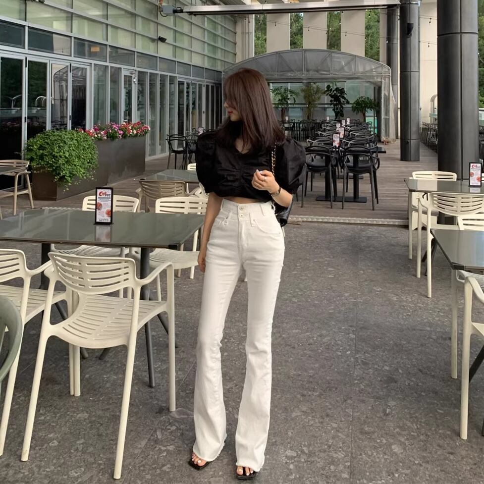 ダブルボタンのハイウエストホワイトデニム。コシのある素材が気になるヒップラインをカバー。スレンダーなレッグラインが手に入る。ショート丈トップスやタックINとも好相性。