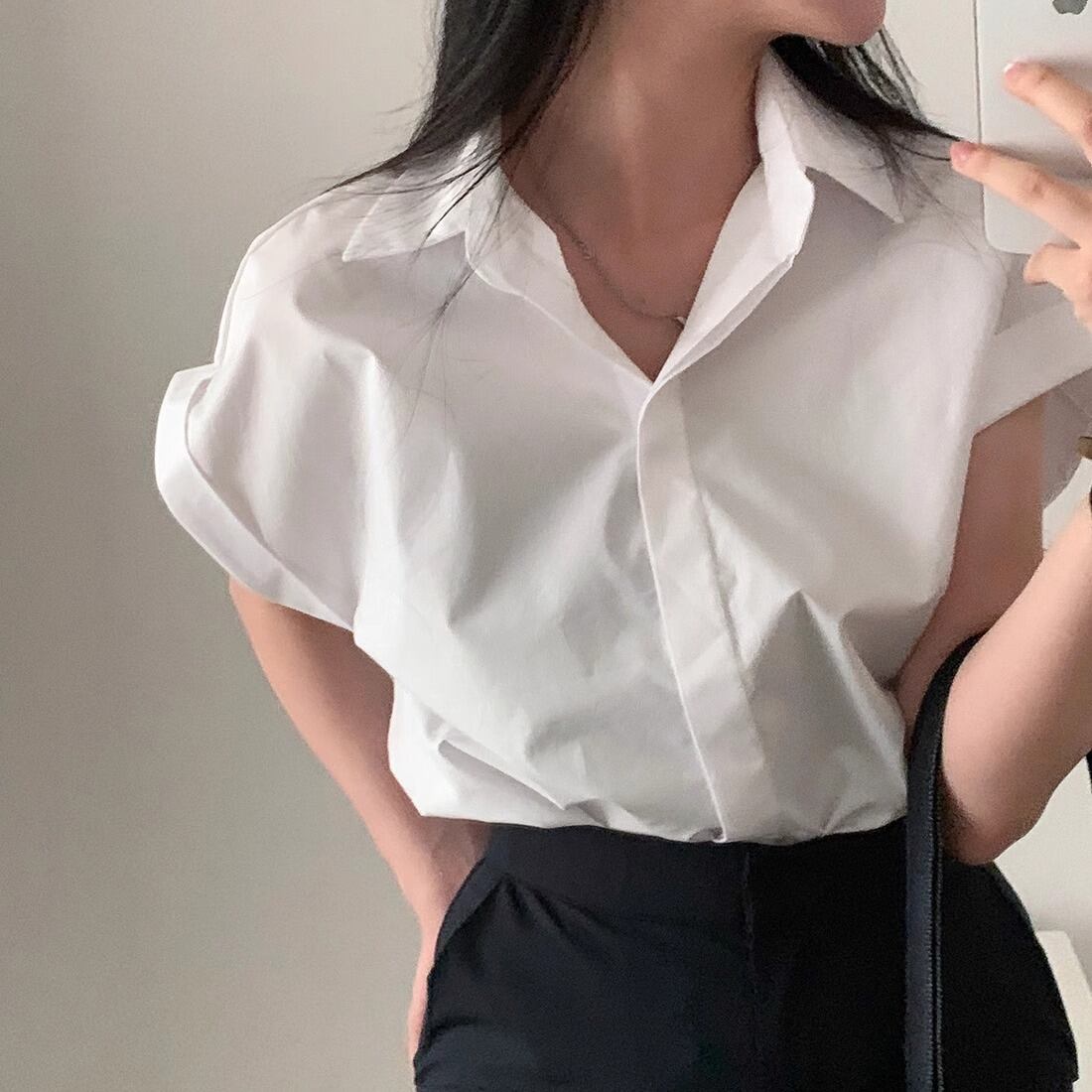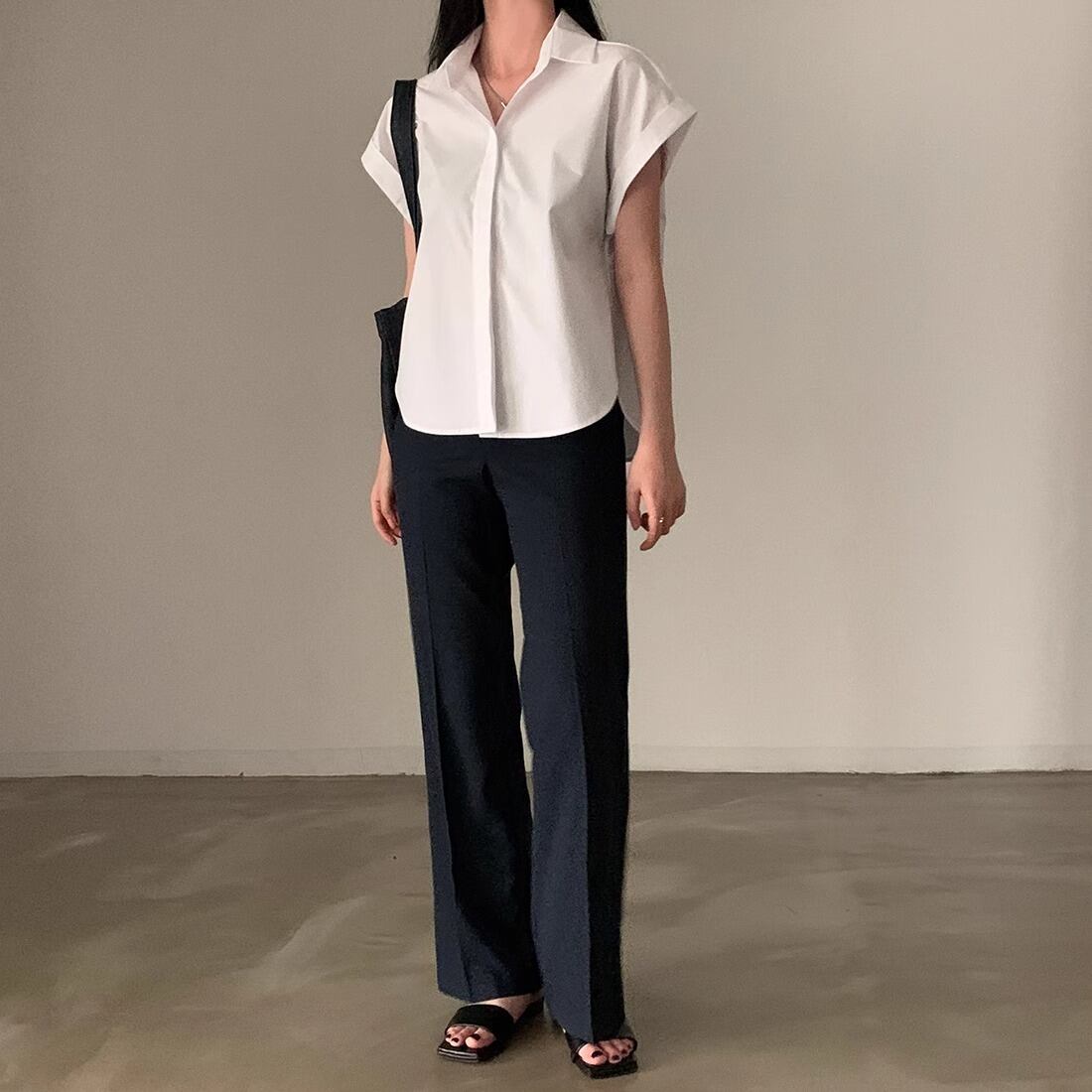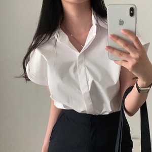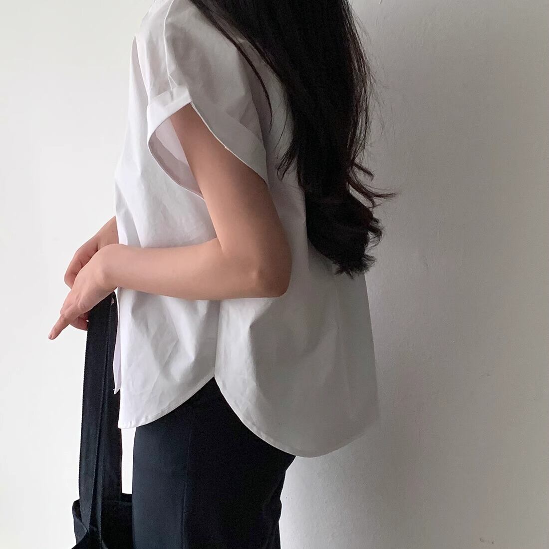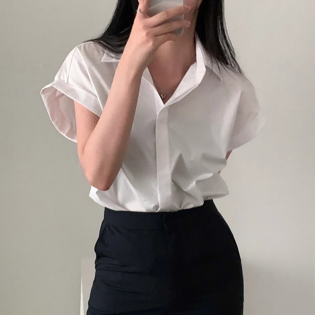 前開きデザインで、普通丈の半袖が大人っぽい印象を与えます。
