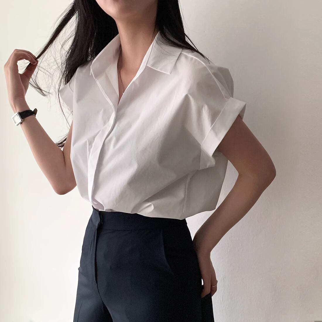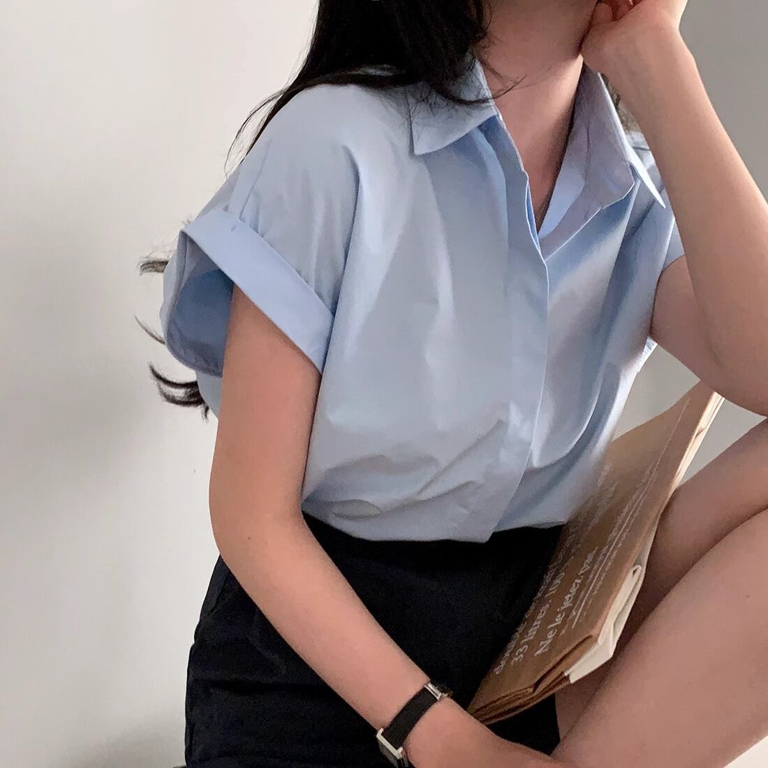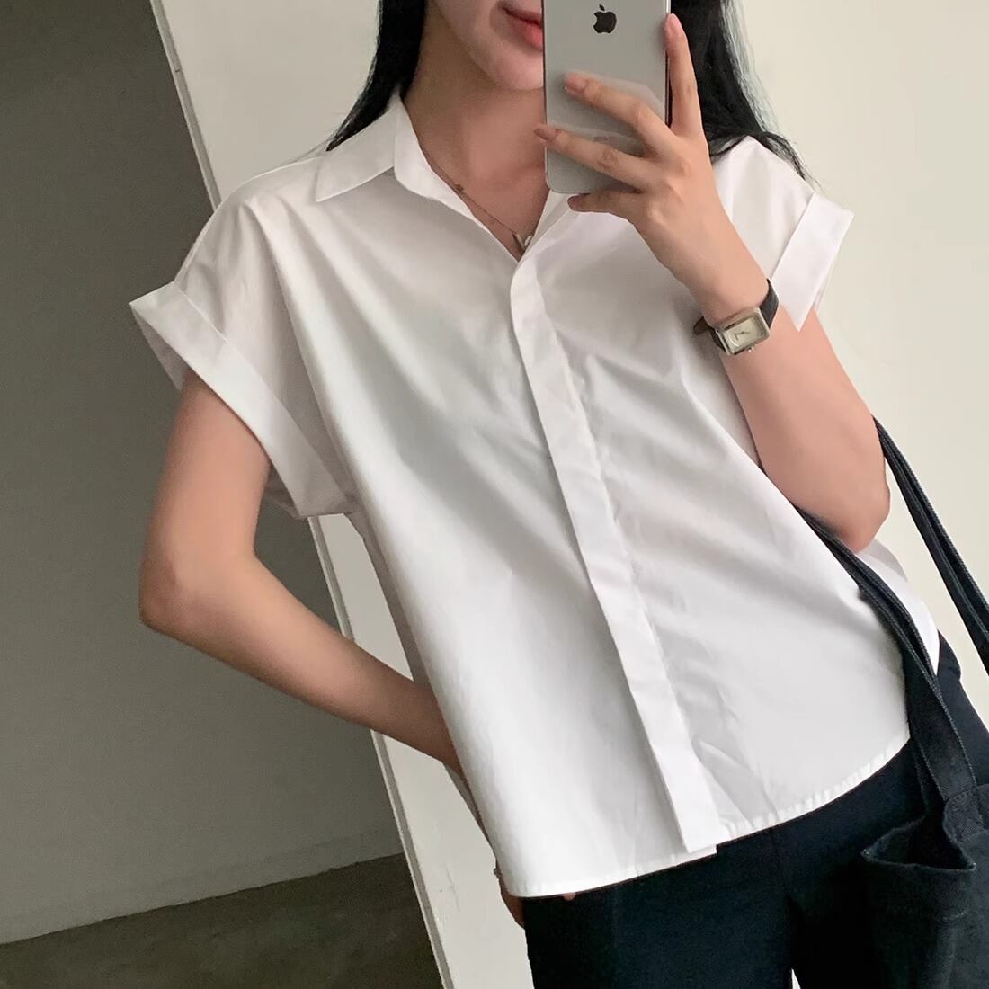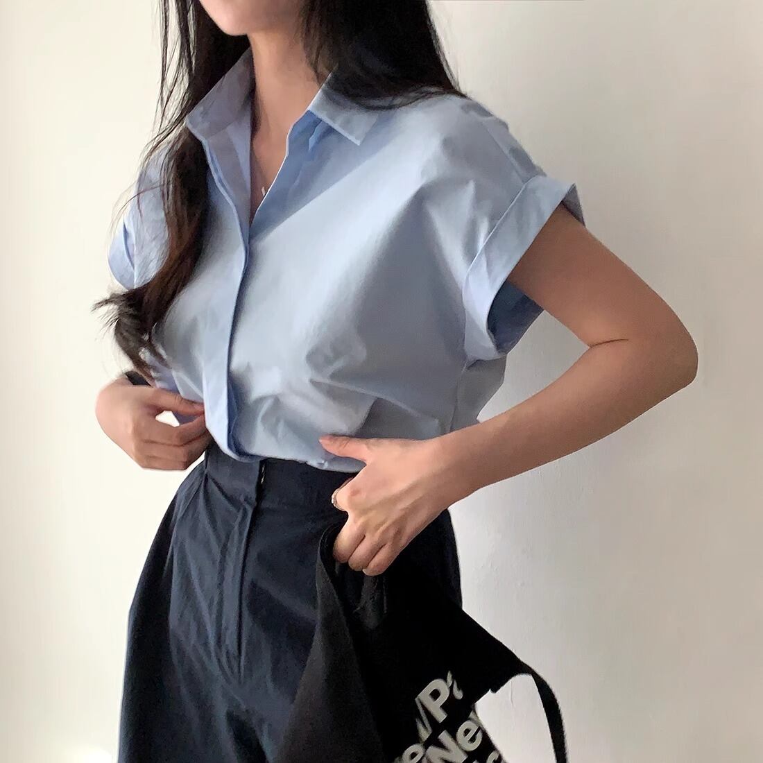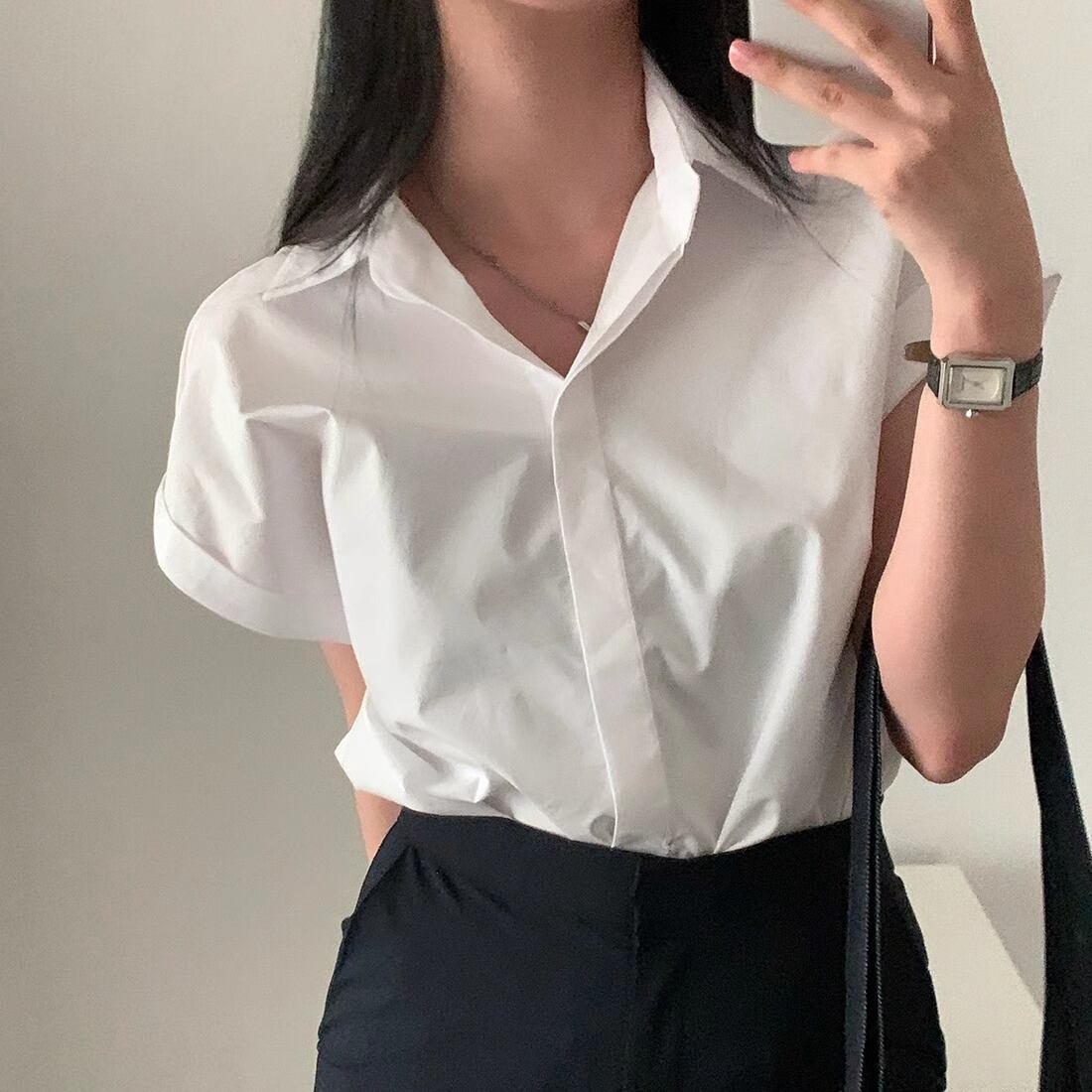 前開きデザインで、普通丈の半袖が大人っぽい印象を与えます。