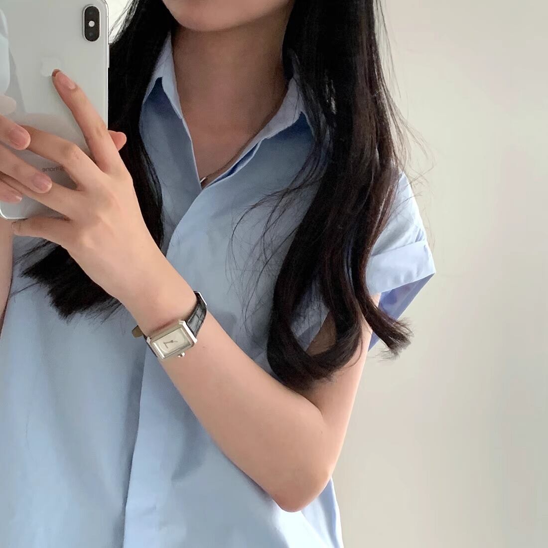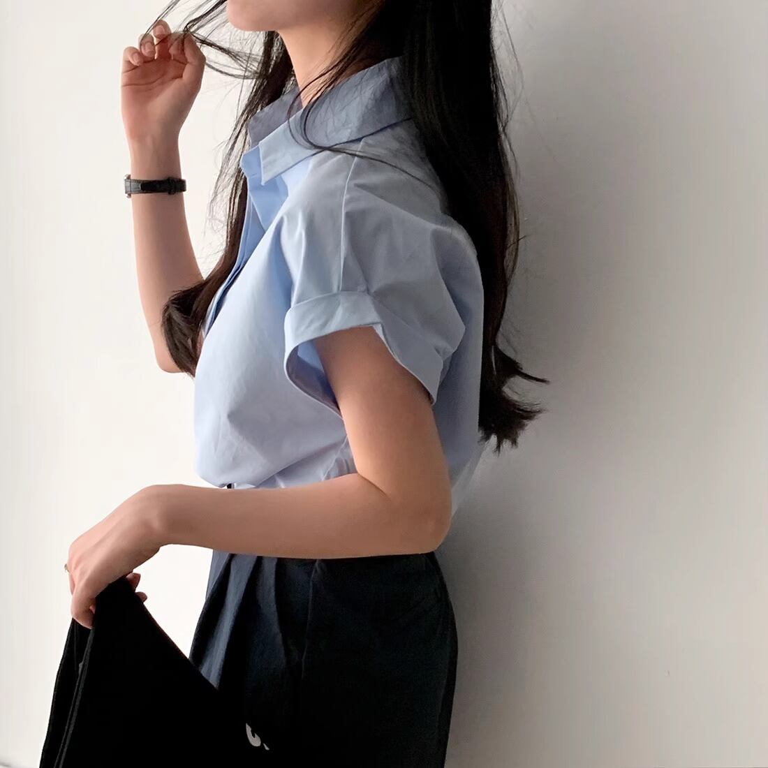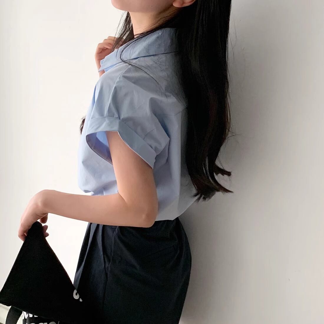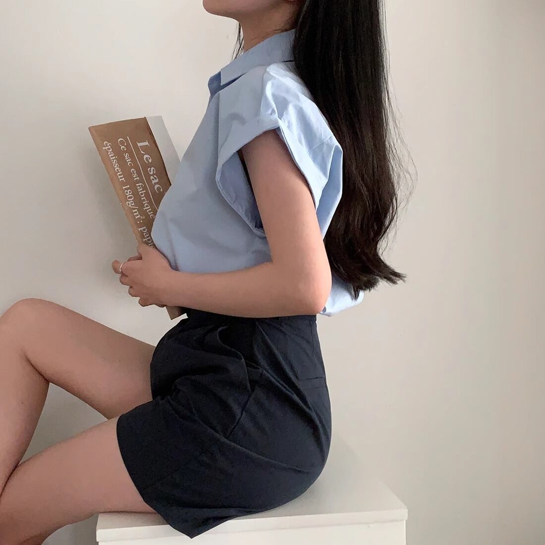 前開きデザインで、普通丈の半袖が大人っぽい印象を与えます。