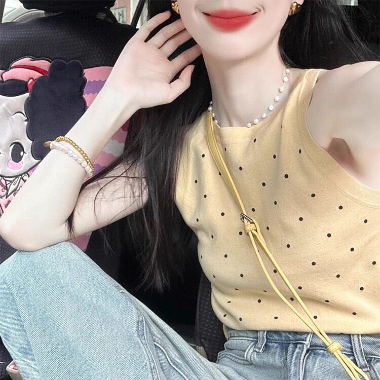 ノースリーブのすっきりとしたデザインに、レトロなドット柄を組み合わせることで、大人可愛い雰囲気を演出します。