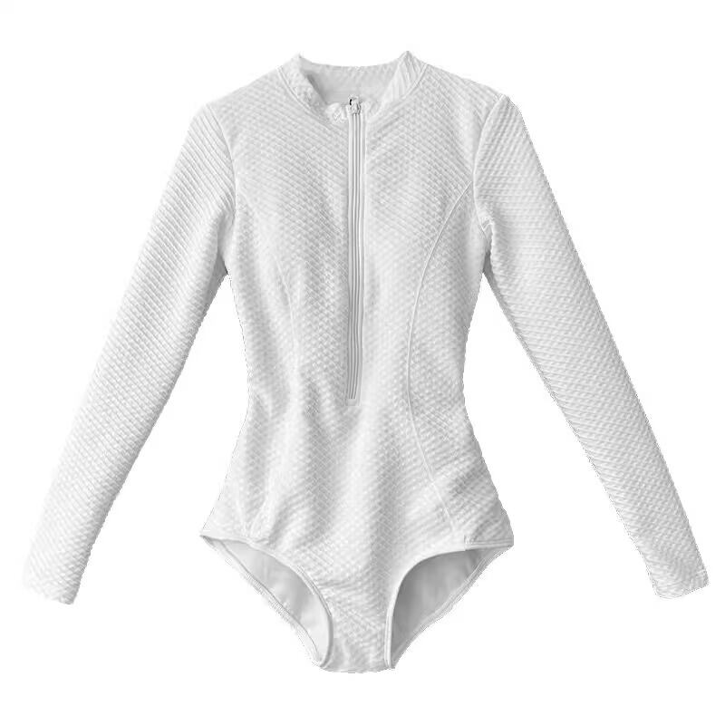 上品なホワイトカラーが爽やかな印象を与える、長袖ワンピースタイプのレディース水着です。