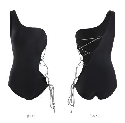 ワンショルダーとサイド編み上げデザインが目を惹く、大人っぽく華やかなレディース水着。シンプルな無地ながら、ゴージャスで個性的なディテールが主役級の存在感を放ちます。背中見せスタイルがセクシーさとこなれ感を演出し、スタイルアップ効果も抜群です。
