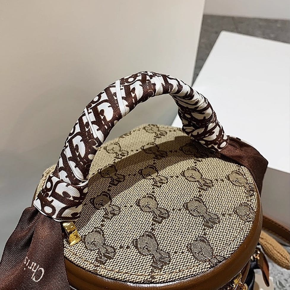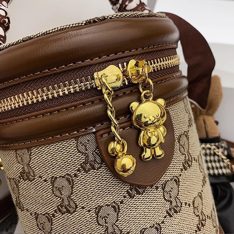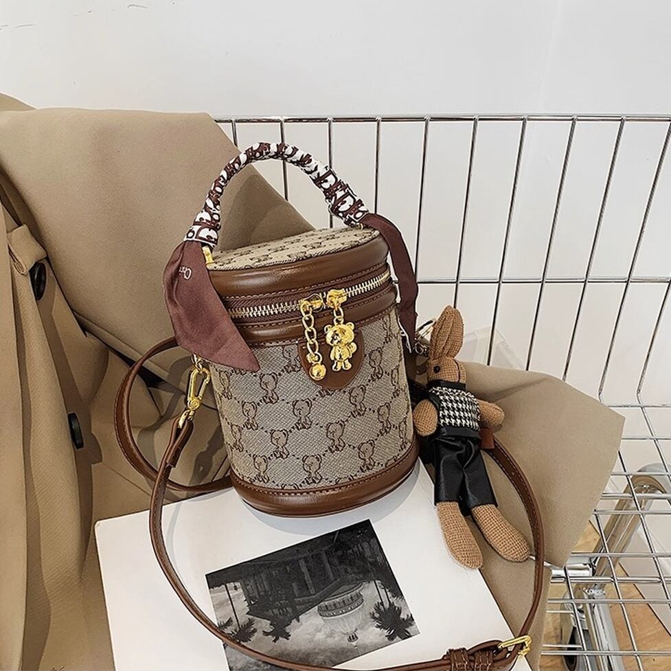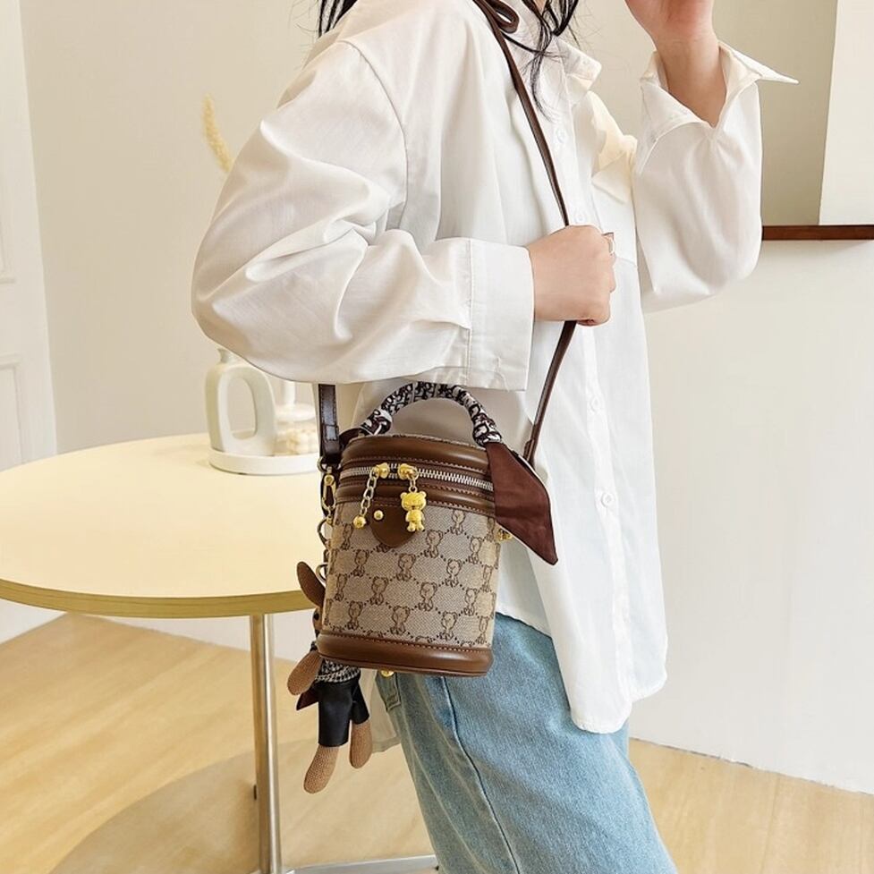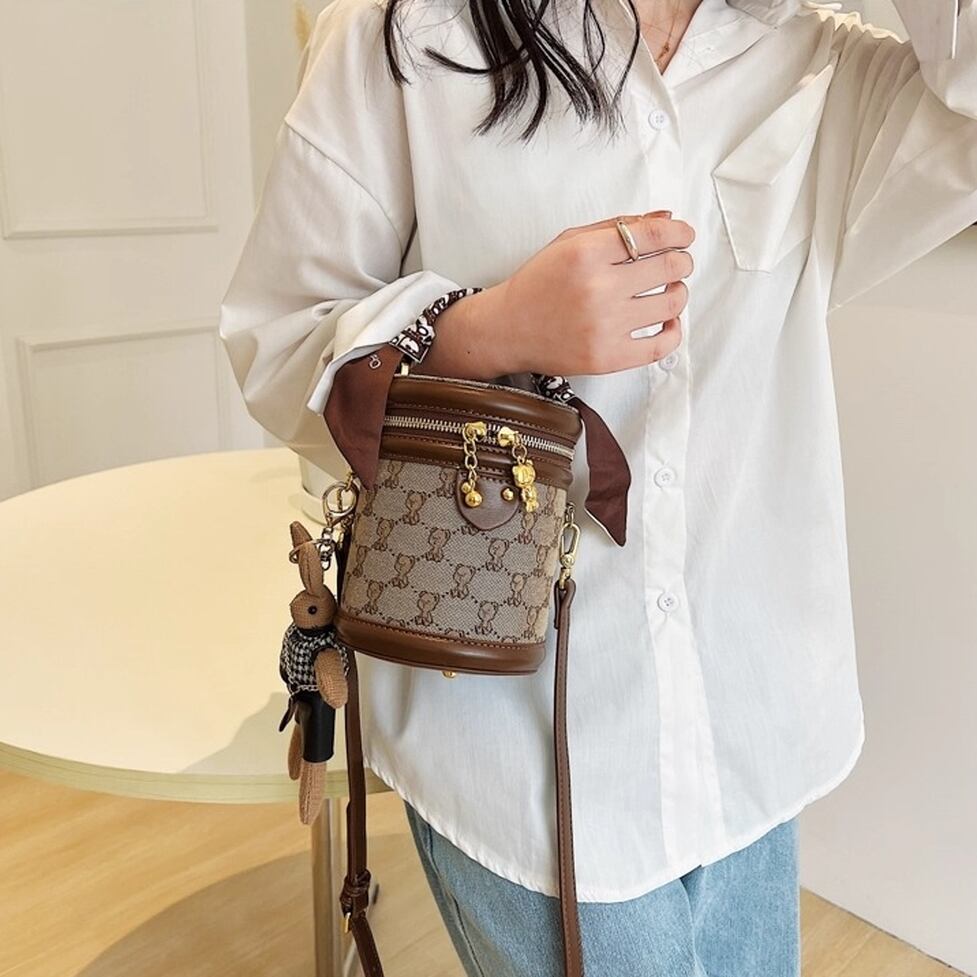コンパクトでかわいい筒型ショルダーバッグ。ハンドルとショルダーストラップ付の2wayで使えます。キャンバス地のクマ模様がかわいいポイント。レトロな雰囲気でコーデをかわいく仕上げてくれるアイテムです。