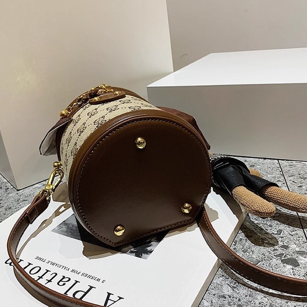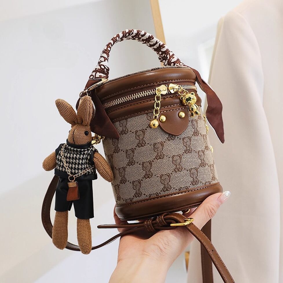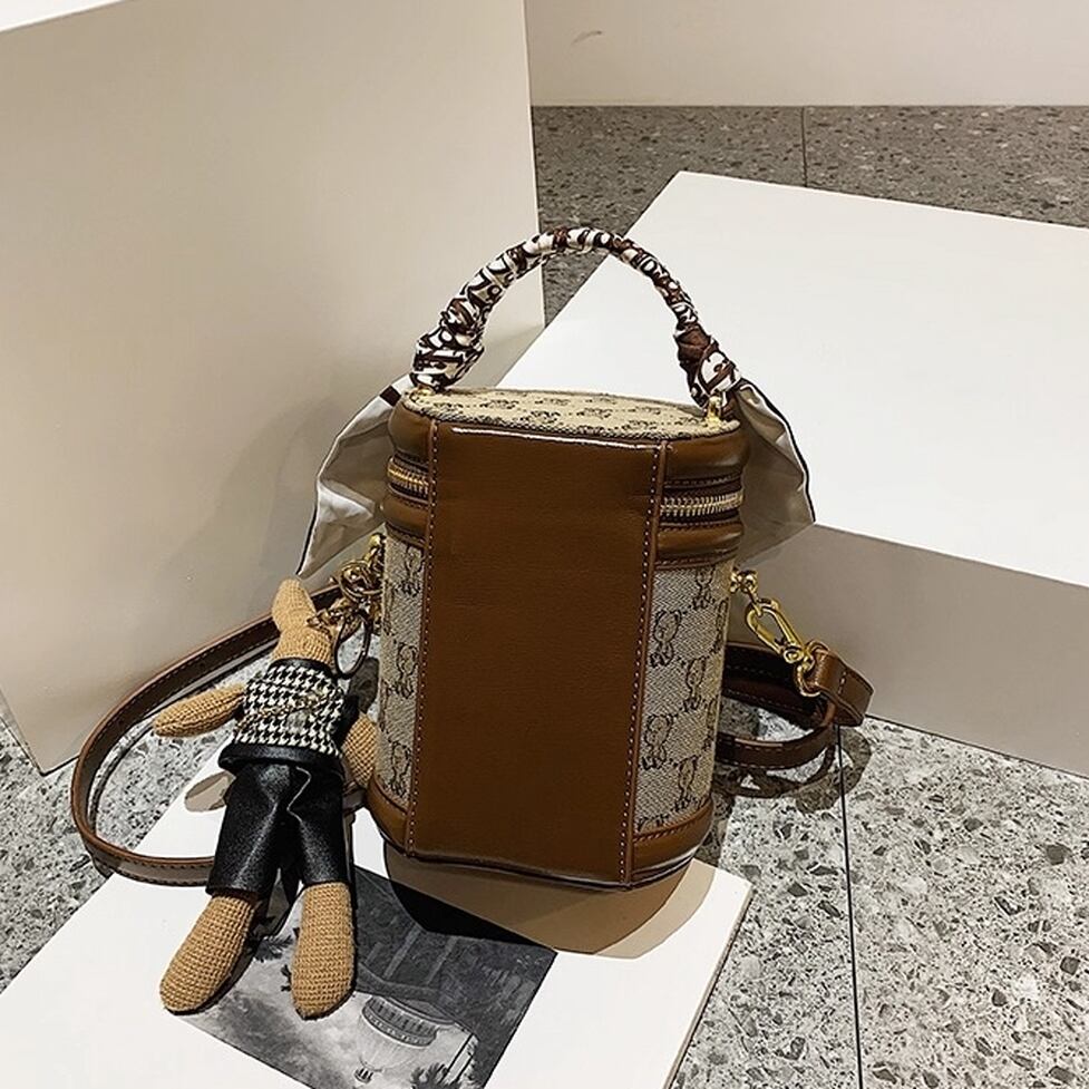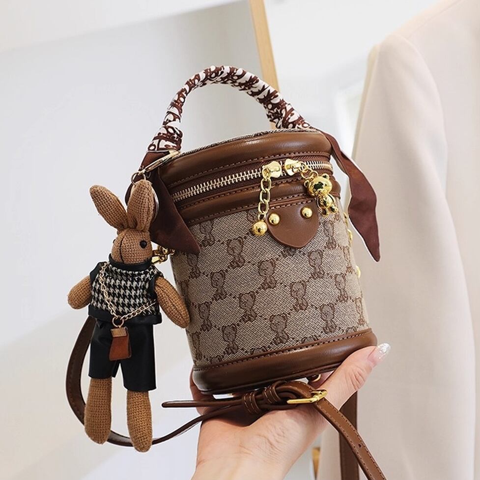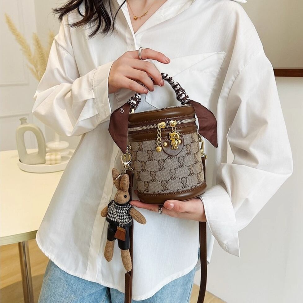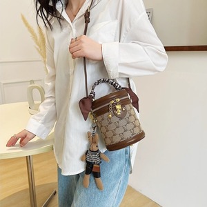 コンパクトでかわいい筒型ショルダーバッグ。ハンドルとショルダーストラップ付の2wayで使えます。キャンバス地のクマ模様がかわいいポイント。レトロな雰囲気でコーデをかわいく仕上げてくれるアイテムです。